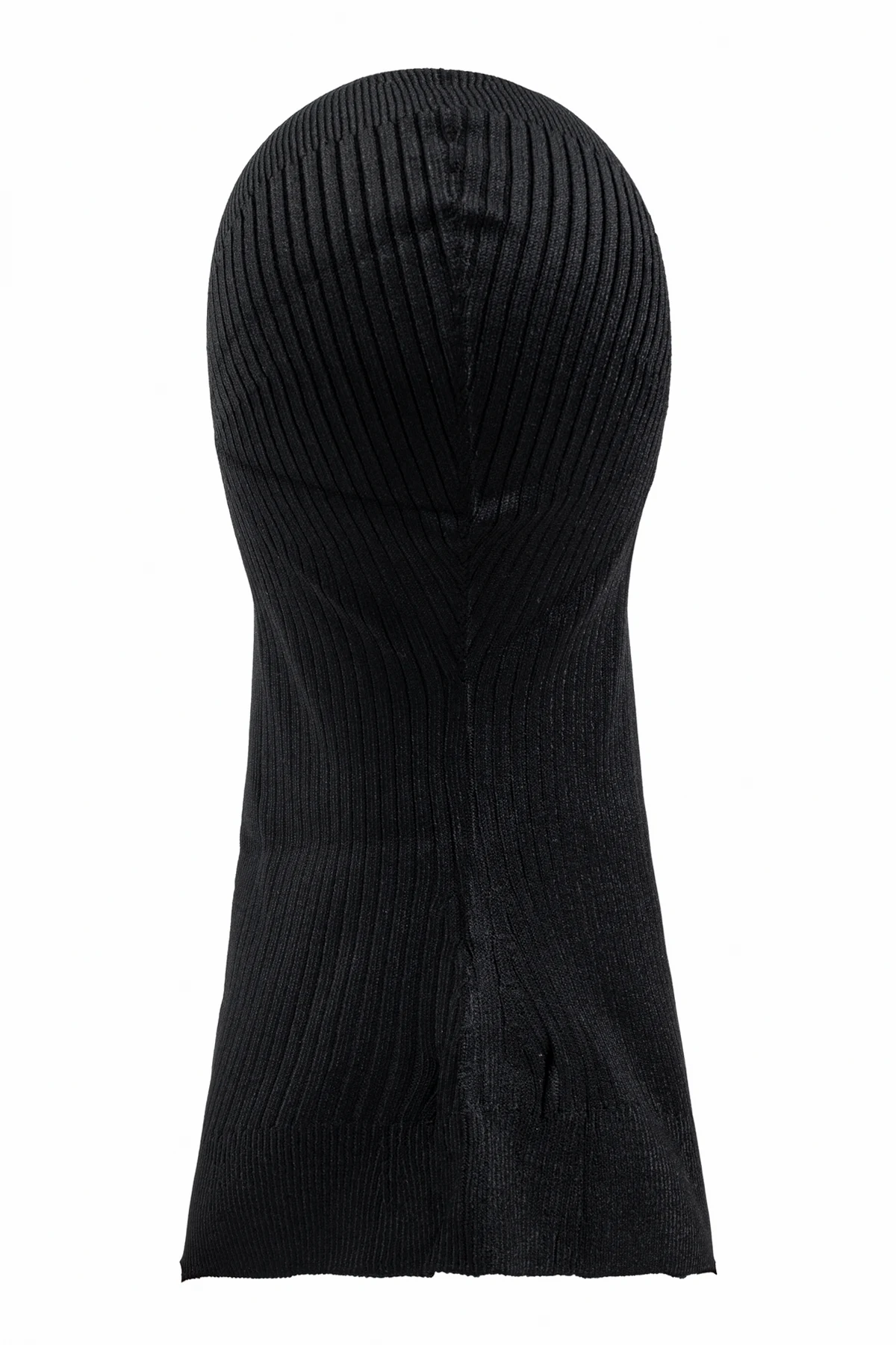 Die dominierende Farbe Schwarz, kombiniert mit einem diskret platzierten, aber erkennbaren Designer-Logo, unterstreicht den exklusiven Charakter der Skimaske. Dieses Design, frei von jeglichen Verschlüssen, ermöglicht ein einfaches und schnelles Überziehen über den Kopf, während es volle Bewegungsfreiheit bietet. Die Öffnungen für Augen und Mund sind so gestaltet, dass sie optimalen Tragekomfort gewährleisten, ohne das Sichtfeld oder die Kommunikation einzuschränken.