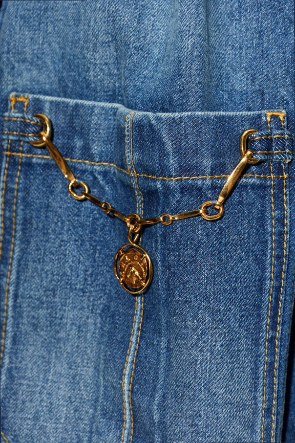 Der blaue Denim mit ausgeprägter Struktur, gefertigt aus natürlicher Baumwolle, präsentiert sich in einem klassischen, einheitlichen Muster ohne überflüssige Verzierungen. Die Jacke wird durch kontrastierende goldene Nähte sowie zwei große, rechteckige Taschen mit dekorativem Kettendetail veredelt – geschmückt mit einem signierten Medaillon, das eine raffinierte Handschrift des Designers darstellt. Abgerundet wird das Ganze durch Knöpfe im antiken Goldstil.