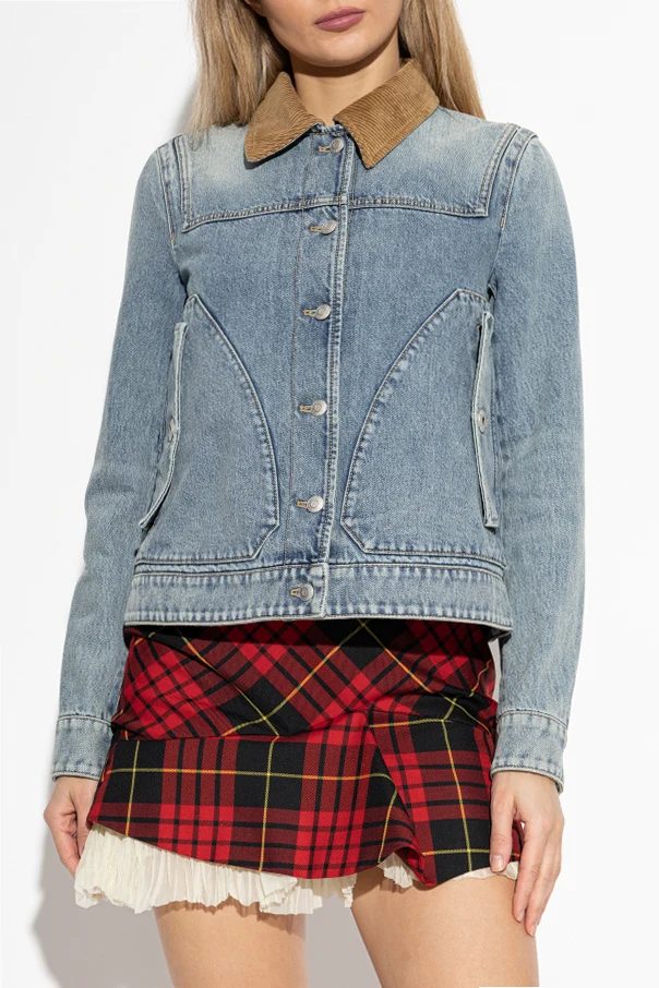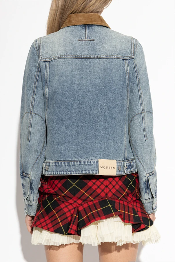 Jeansjacke mit Cordkragen von Alexander McQueen ist eine anspruchsvolle Wahl für Frauen, die subtile Eleganz und designtechnische Raffinesse schätzen. Der klassische, leicht taillierte Schnitt in Hüftlänge betont dezent die Figur und wird durch markante Nähte an der Vorderseite und den Schultern zusätzlich hervorgehoben.