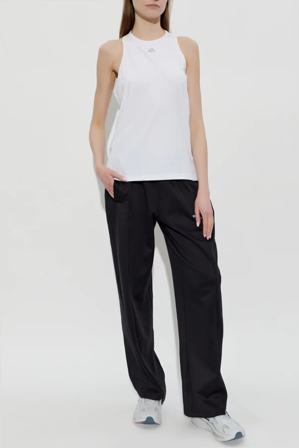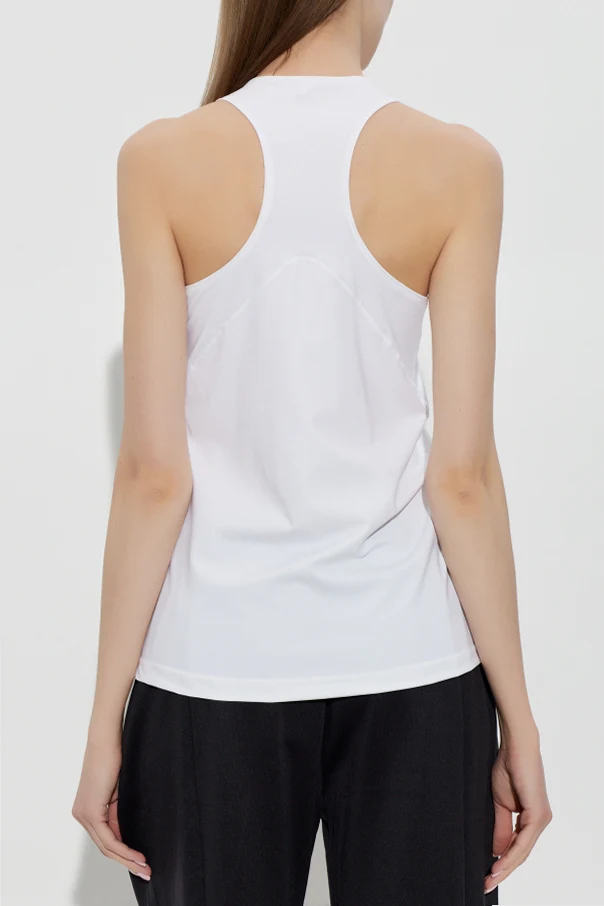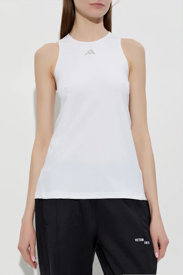 Ärmelloses Top aus der exklusiven Adidas Performance Kollektion verkörpert die Quintessenz moderner sportlicher Eleganz. Sein minimalistischer Charakter wird durch den glatten, weißen Stoff unterstrichen, der harmonisch mit dem dezent grauen Designerlogo zusammenspielt, das mittig unter dem Halsausschnitt platziert ist. Breite Träger und ein hochgeschlossener Ausschnitt vereinen Komfort mit zeitloser Ästhetik, während der Racerback-Rücken vollständige Bewegungsfreiheit garantiert – perfekt geeignet für körperliche Aktivitäten.