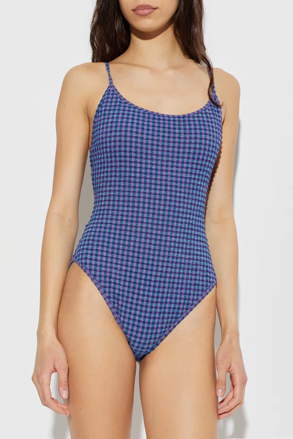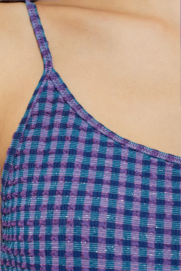 Der Badeanzug ist aus Jacquard-Strick mit ausdrucksvoller Struktur gefertigt, in einem violetten Farbton mit Akzenten von dunkelblauem Karo. Zarte, metallisierte Fäden, die in das Material eingearbeitet sind, verleihen dem Ganzen einen dezenten Schimmer und unterstreichen den raffinierten, luxuriösen Charakter des Designs.