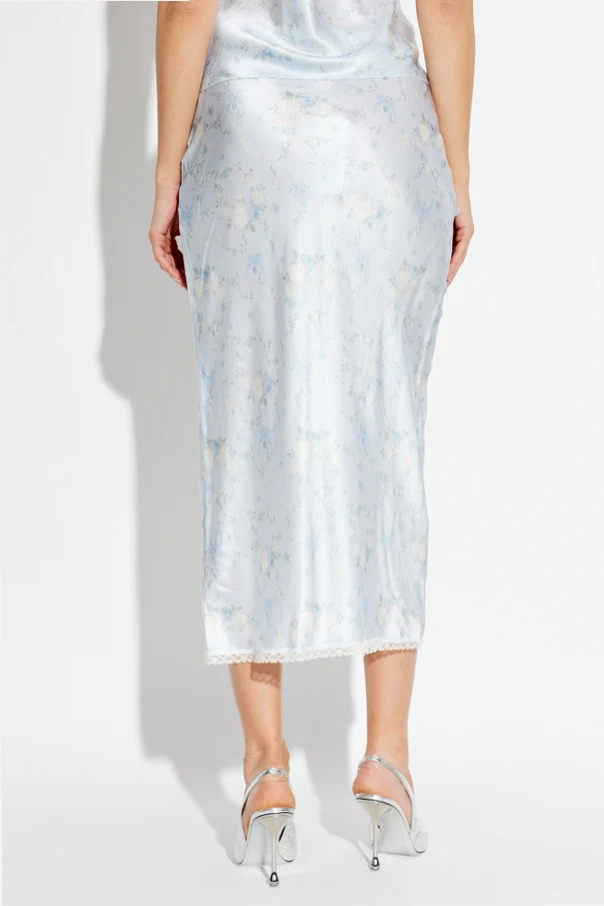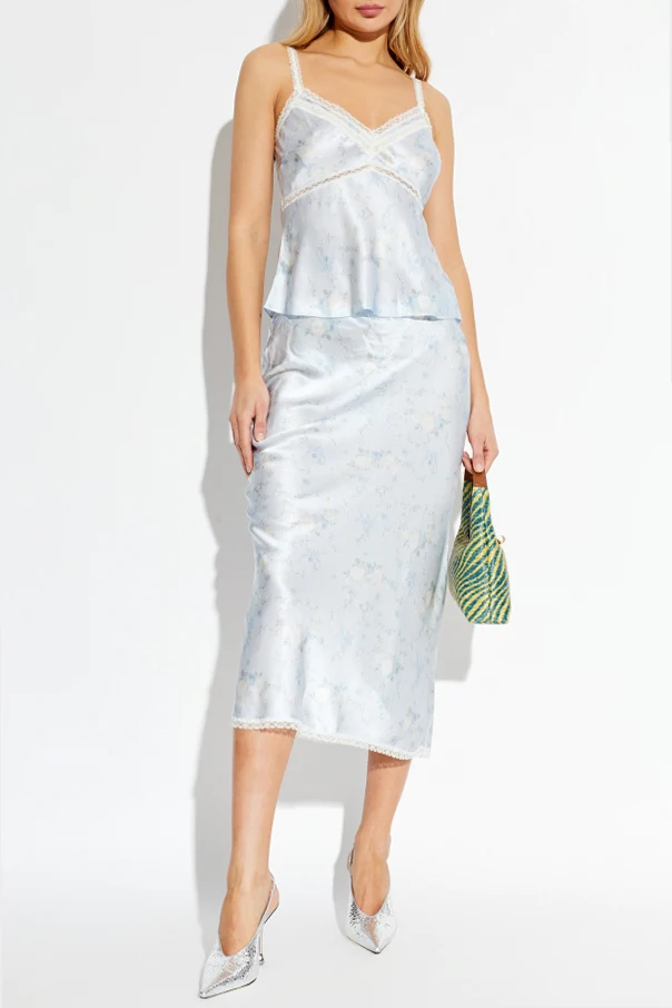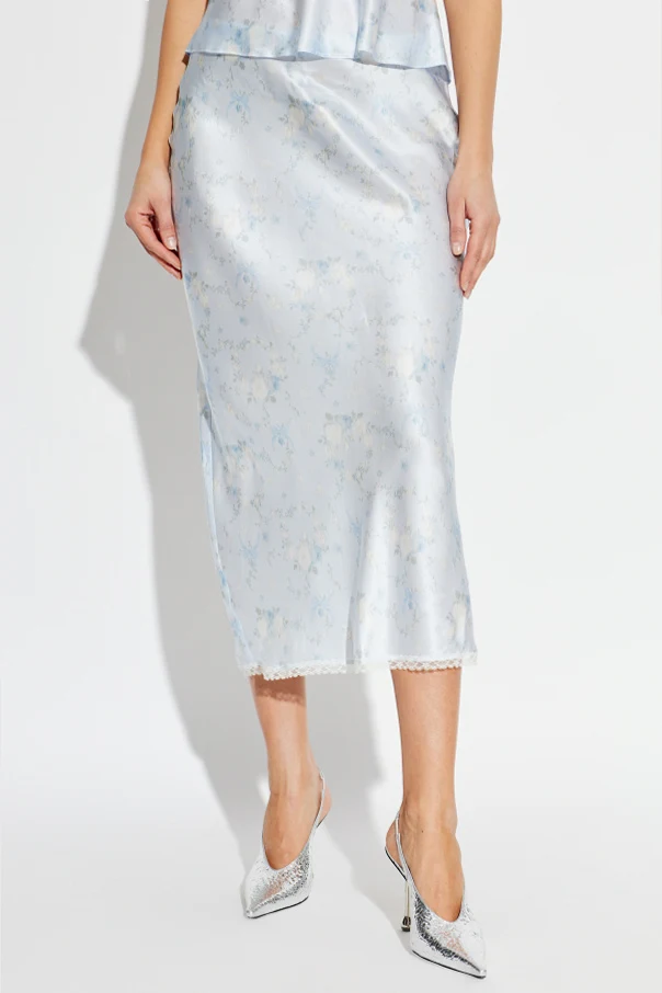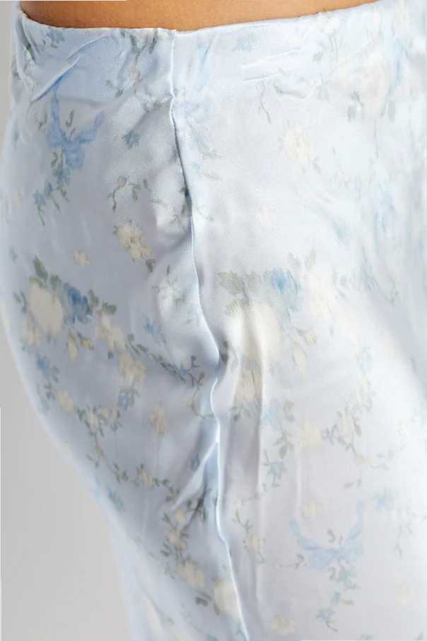 Der Seidenrock „Kalo“ von LoveShackFancy begeistert mit raffinierter Eleganz, die durch meisterhaft ausgewählte, leicht schimmernde Seide unterstrichen wird. Das dezente, florale Muster in pastelligen Nuancen von Weiß, Blau und Pastellgrün verschmilzt fast mit dem Hintergrund und verleiht dem Gesamtbild künstlerische Finesse. Der Rock reicht bis zur Mitte der Wade, schmiegt sich sanft an die Hüftlinie an und fällt am Saum leicht ausgestellt – der Slip-Skirt-Schnitt verleiht der Silhouette Leichtigkeit und fließende Bewegungen.