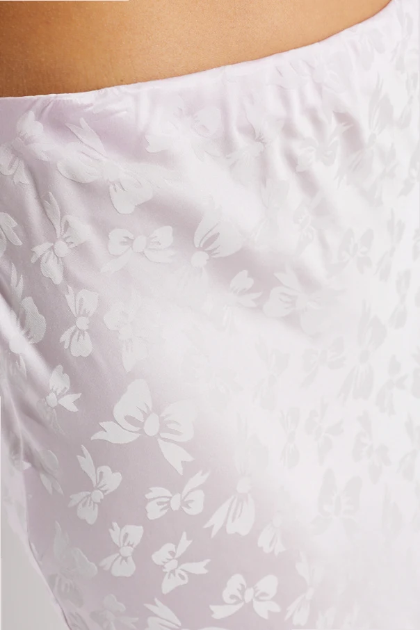 Das Material, eine edle Kombination aus Viskose und Seide, macht diesen Rock besonders geschmeidig und angenehm im Griff. Das satinierte Finish mit leichtem Glanz verleiht ihm luxuriöse Ausstrahlung, während das zarte Jacquard-Muster mit Schleifenmotiven das Gesamtbild dezent schmückt und durch seine elegante Textur besticht.