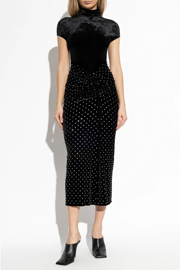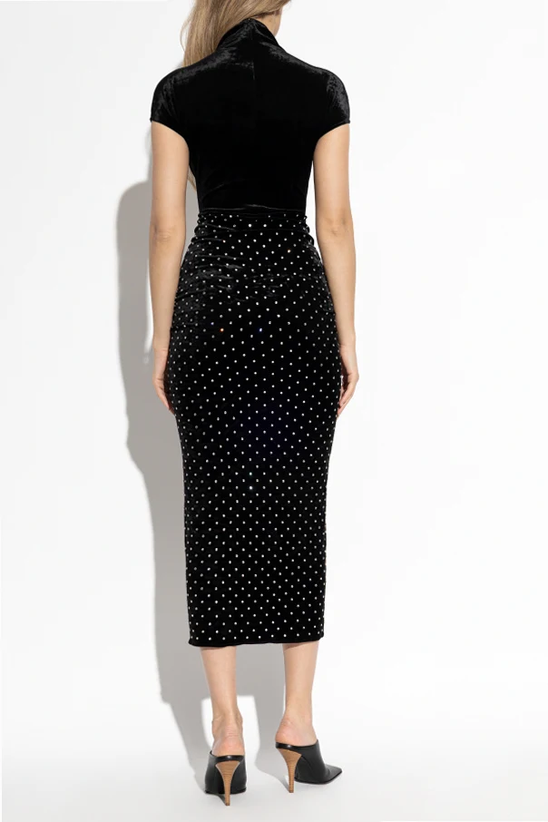 Samtkleid mit glänzenden Pailletten der Marke Alaïa ist ein einzigartiges Angebot für Liebhaberinnen zeitloser Eleganz. Das schwarze Samt-Finish mit tiefem Glanz betont die Figur subtil durch den taillierten, verlängerten Midi-Schnitt. Die kurzen Ärmel und der leicht erhöhte Stehkragen bringen die Eleganz vergangener Jahrzehnte zurück und unterstreichen den raffinierten Charakter des Designs.