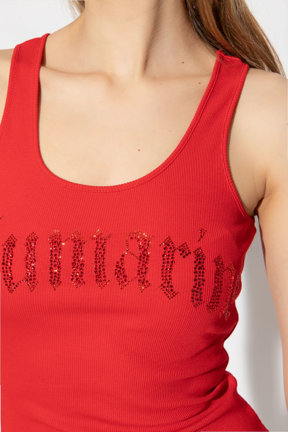 Red maxi sleeveless dress from Blumarine. Crafted from ribbed fabric with a form-fitting silhouette, this style features a round neck and a glossy logo application on the front.