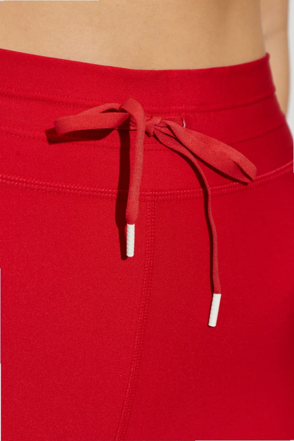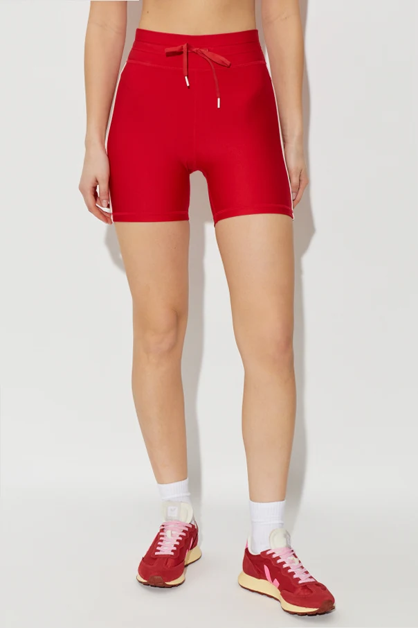 Dieser körpernah geschnittene Style, der bis über das Knie reicht, modelliert die Silhouette hervorragend, während das hochwertige, elastische Material außergewöhnlichen Komfort und eine perfekte Passform bietet. Der glatte, hohe Bund mit einem Kordelzug, der mit kontrastierenden weißen Enden versehen ist, bildet ein raffiniertes praktisches Detail und betont den sportlichen Charakter der Shorts. Dezente Nähte unterstreichen subtil die Körperlinie, während das Fehlen von Prints und sichtbaren Logos die edle Minimalistik des Designs hervorhebt.
