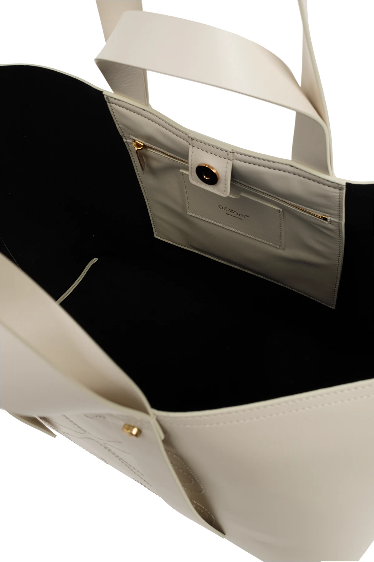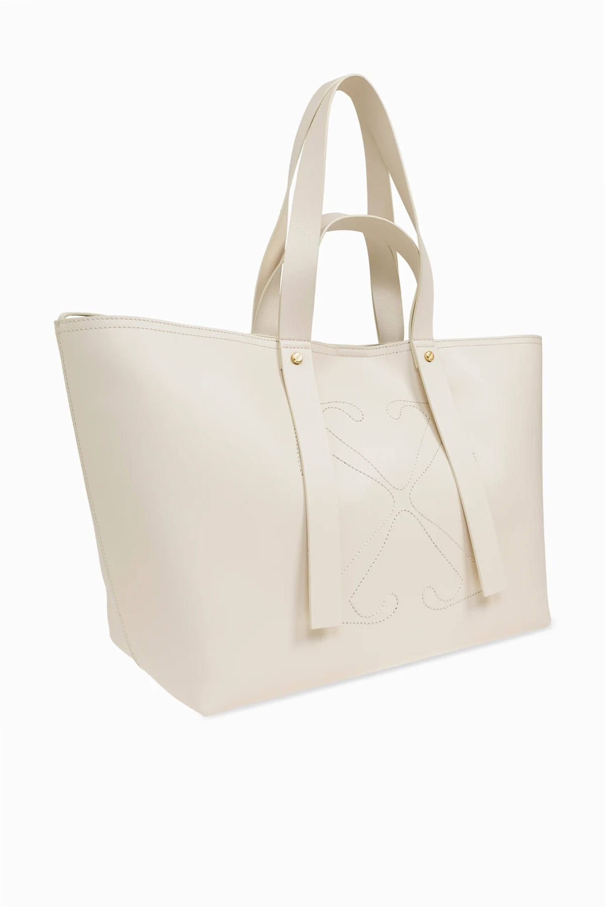 Die Shopper -Tasche von dem renommierten Designer Off-White , die subtilen Luxus ausstrahlt, ist die Quintessenz von Eleganz kombiniert mit Praktikabilität. Ihre cremig-graue Farbgebung, eingebettet in eine rechteckige, leicht trapezförmige Silhouette, macht sie nicht nur zu einem Gebrauchsgegenstand, sondern auch zu einem raffinierten Accessoire für jede Garderobe. Aus hochwertigem 100% Kalbsleder gefertigt, beeindruckt diese Tasche durch die Glätte und Langlebigkeit des Materials.