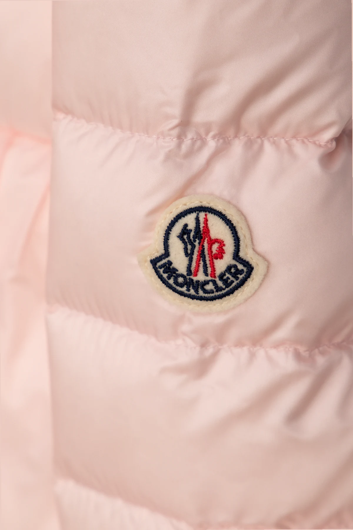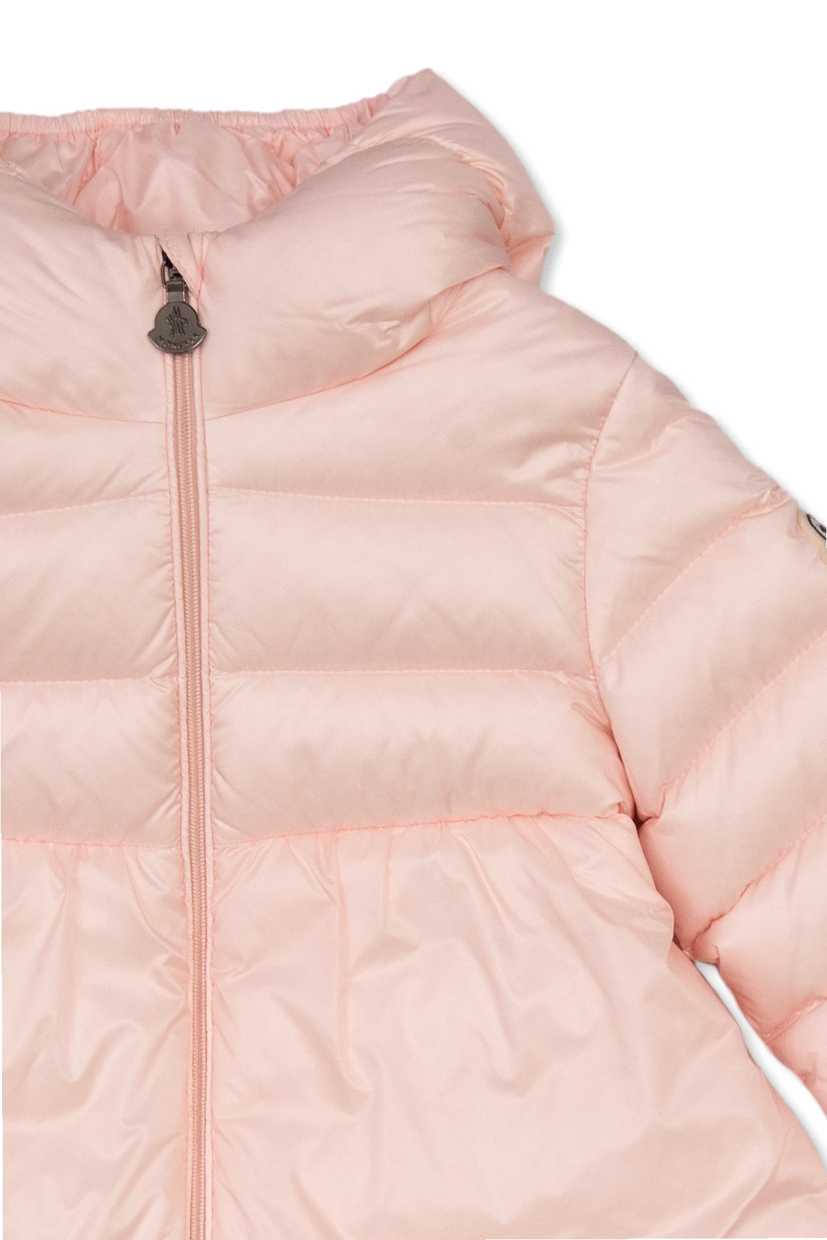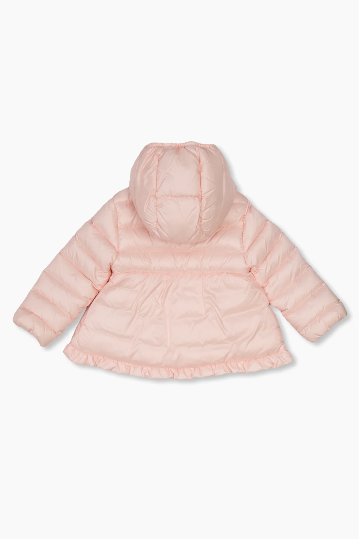 Light pink quilted jacket with a hood from Moncler Enfant. This style fastens via a zip and features a ruffled hem, down padding and long sleeves – one has a colourful logo patch.