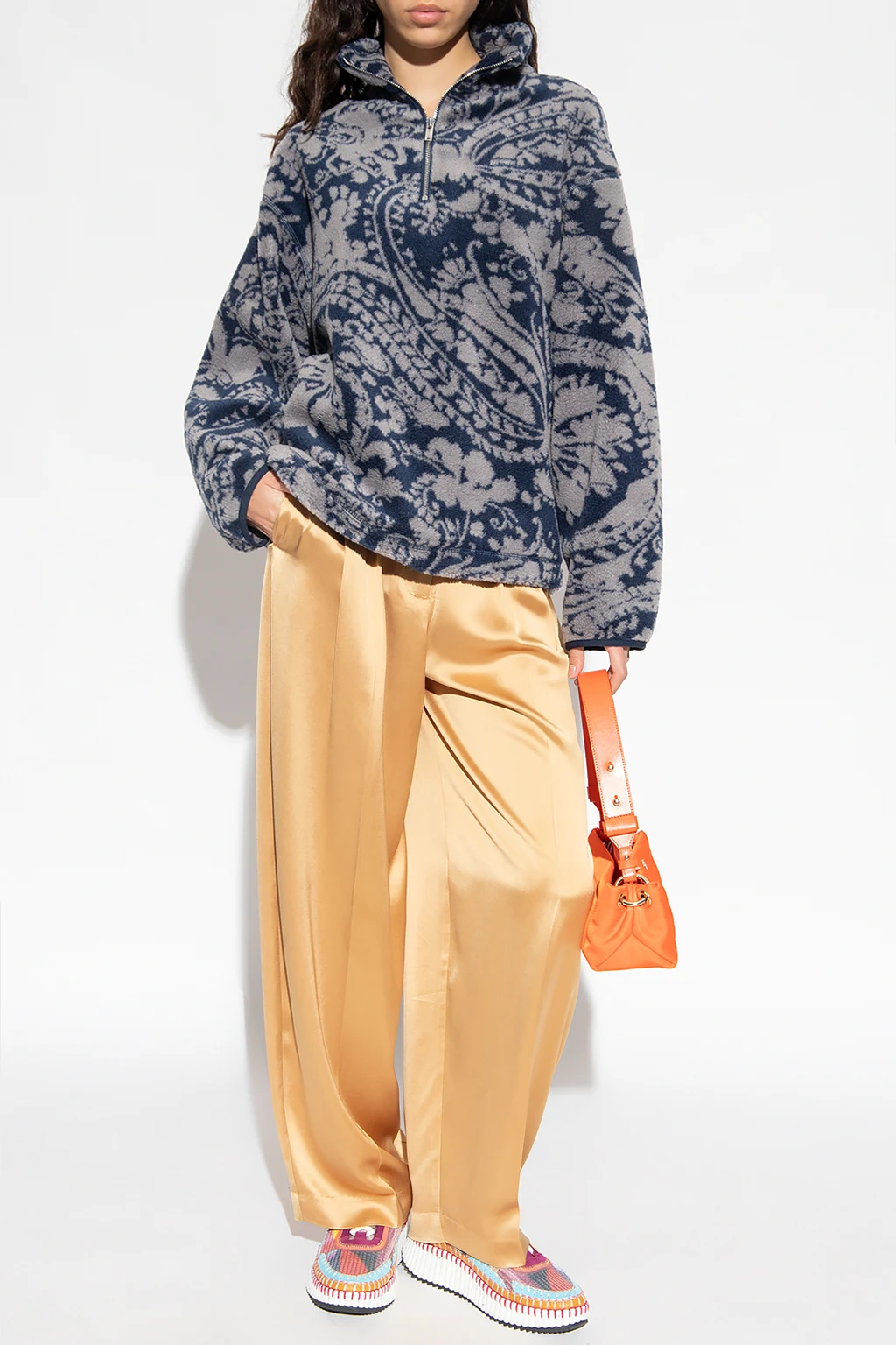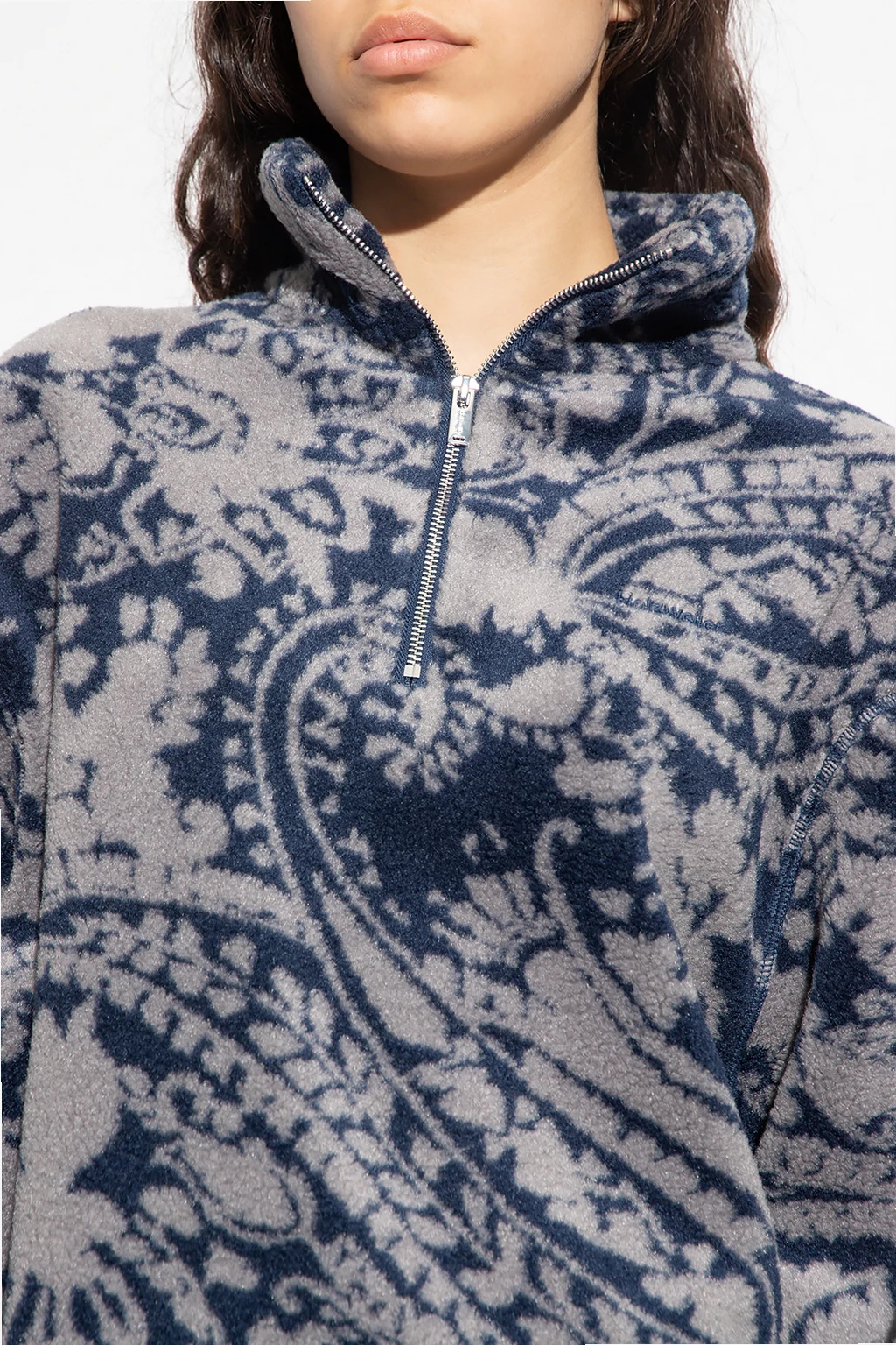 Grey and navy ‘Archie’ fleece sweatshirt from Holzweiler. Made of recycled fabric, this garment features a zipped stand collar, paisley pattern, logo embroidery, drawstring hem and long sleeves.