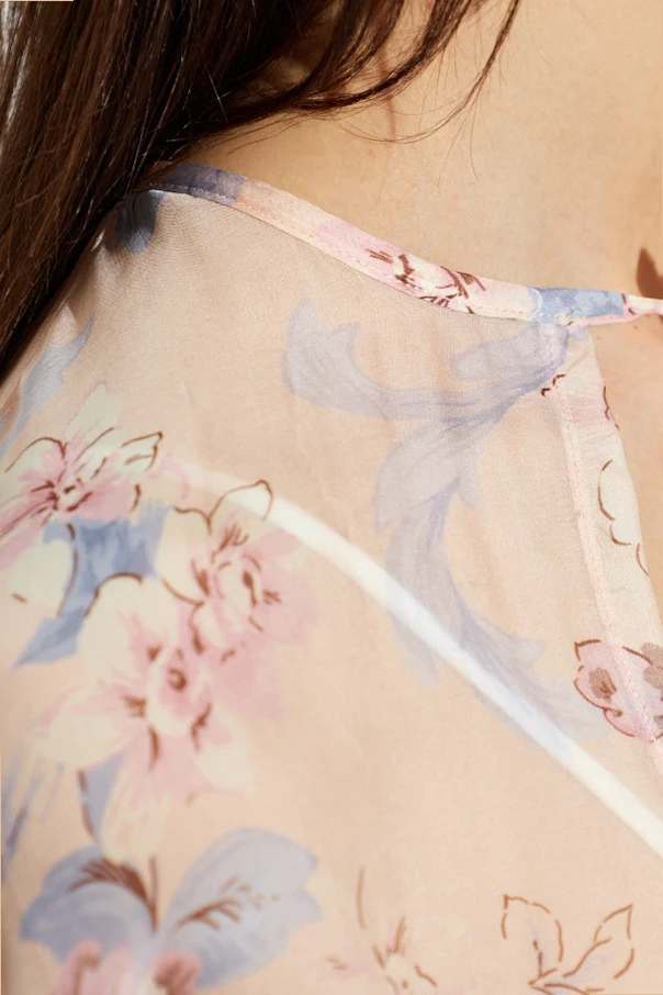 Die dominante rosa Farbe in Verbindung mit pastelligen Nuancen von Blau und Violett schafft eine harmonische Komposition. Das Bindebändchen am Hals sowie die meisterhafte Ausarbeitung der Details unterstreichen die Einzigartigkeit dieses Kleides und machen es zu einem Ausdruck zeitloser Eleganz.
