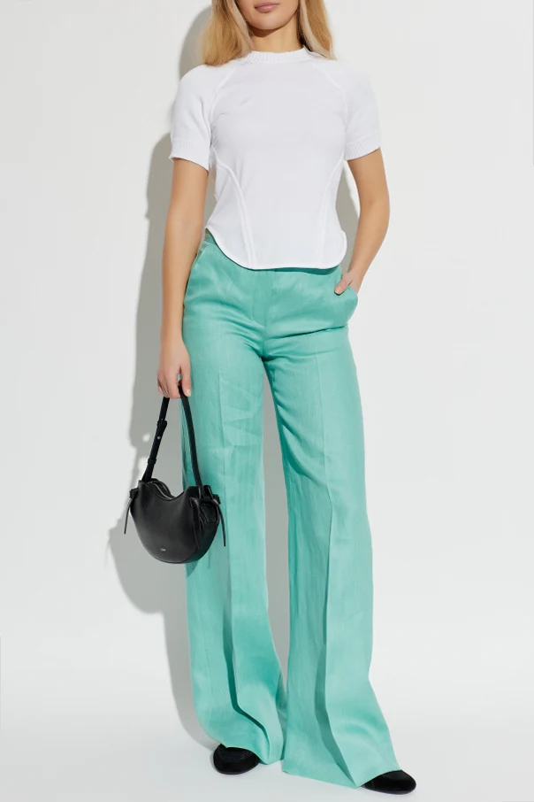 Top „Egrege” von Sportmax verkörpert die Essenz moderner Eleganz und vereint die Synergie italienischer Schneidertradition mit innovativen Materialien. Sein taillierter, leicht figurbetonter Schnitt betont die natürliche Silhouette, während die kurzen Ärmel mit markanter Rippung und der unkonventionell abgerundete Saum eine besonders raffinierte Linienführung schaffen.