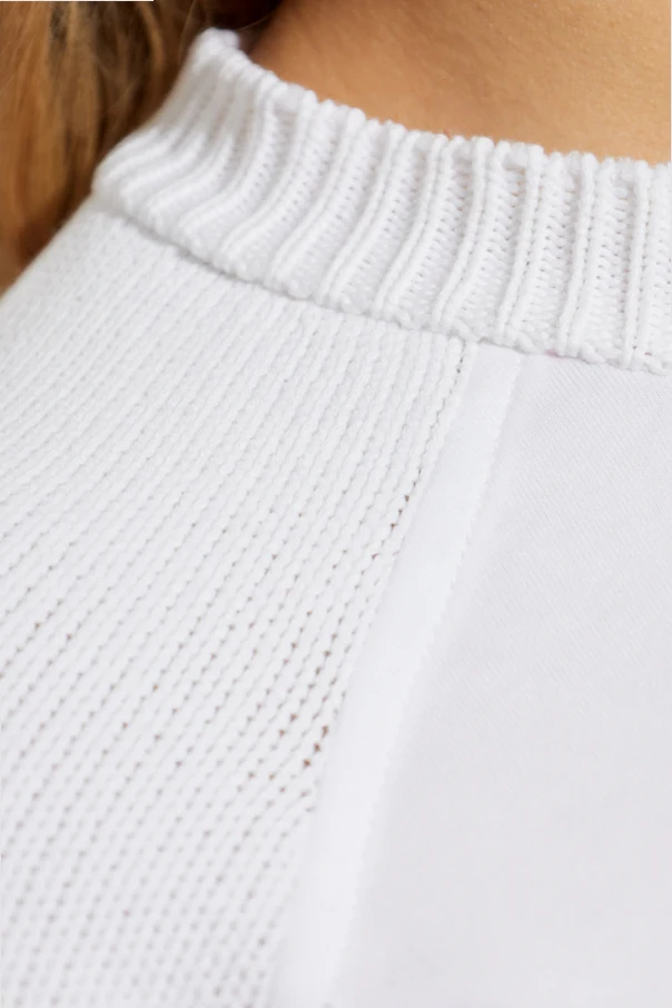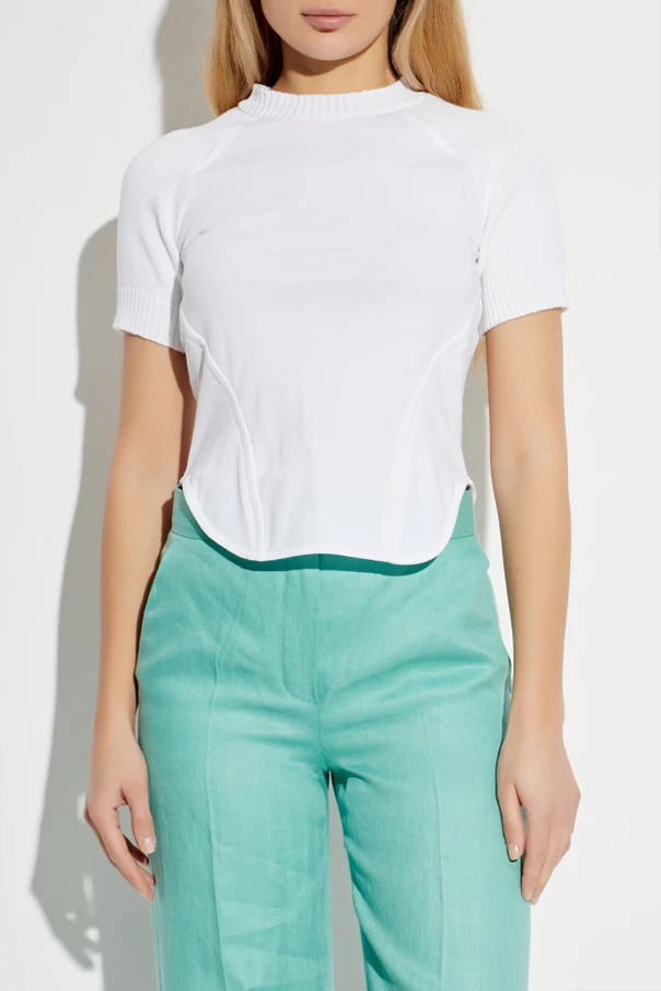 Die Einzigartigkeit des Tops wird durch dezente formgebende Steppnähte hervorgehoben, die sowohl entlang der Seiten als auch an den Ärmeln verlaufen; die Panelkonstruktion setzt die Vorzüge der Figur subtil in Szene. Der weiße Strick mit samtiger Textur, ergänzt durch Details aus Baumwolle, Elasthan und Polyamid, bietet nicht nur Tragekomfort, sondern auch Langlebigkeit und perfekte Passform.