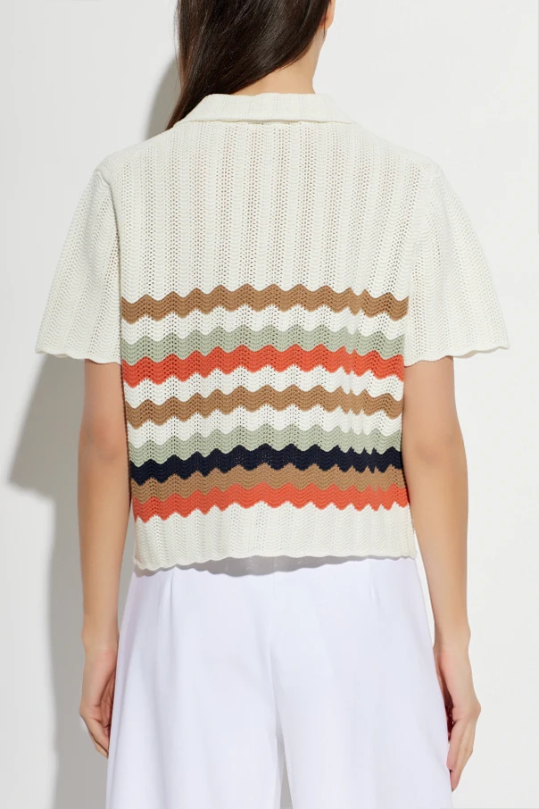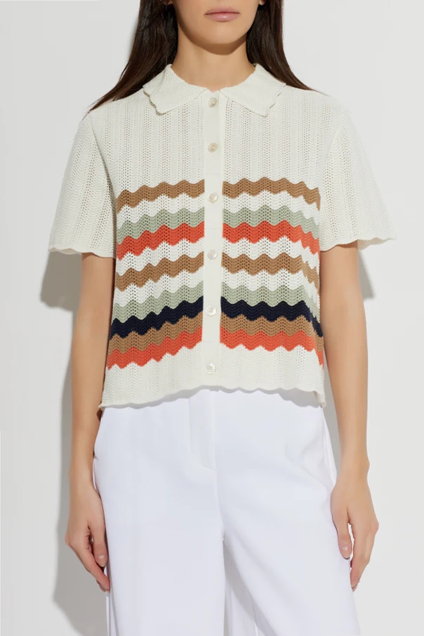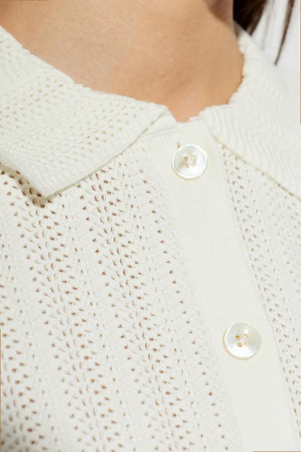 Das luftige, durchbrochene Strickmaterial aus Baumwolle sorgt selbst an den wärmsten Tagen für höchsten Tragekomfort, während die einheitliche Knopfleiste in Creme die außergewöhnliche Komposition abrundet.