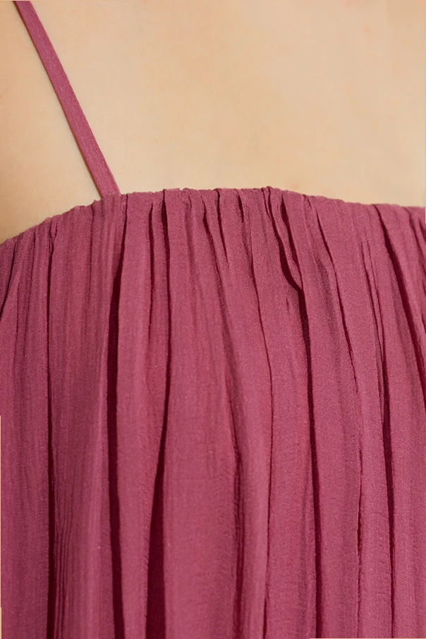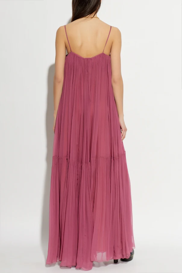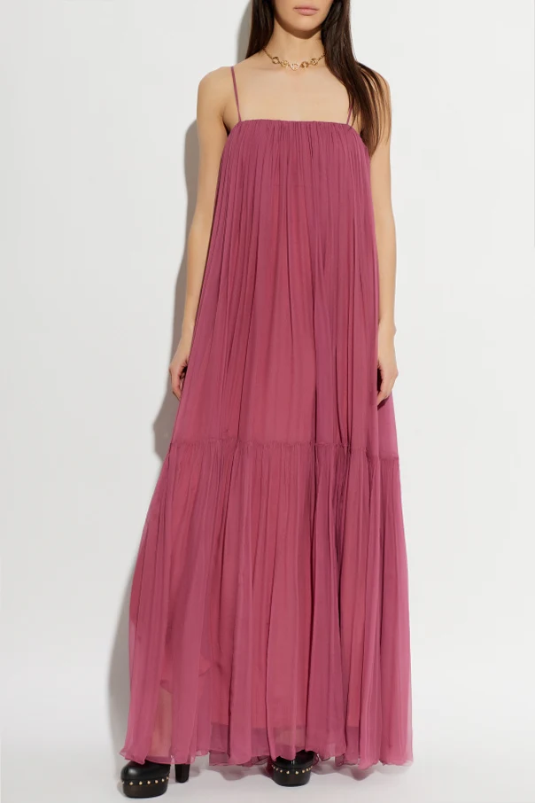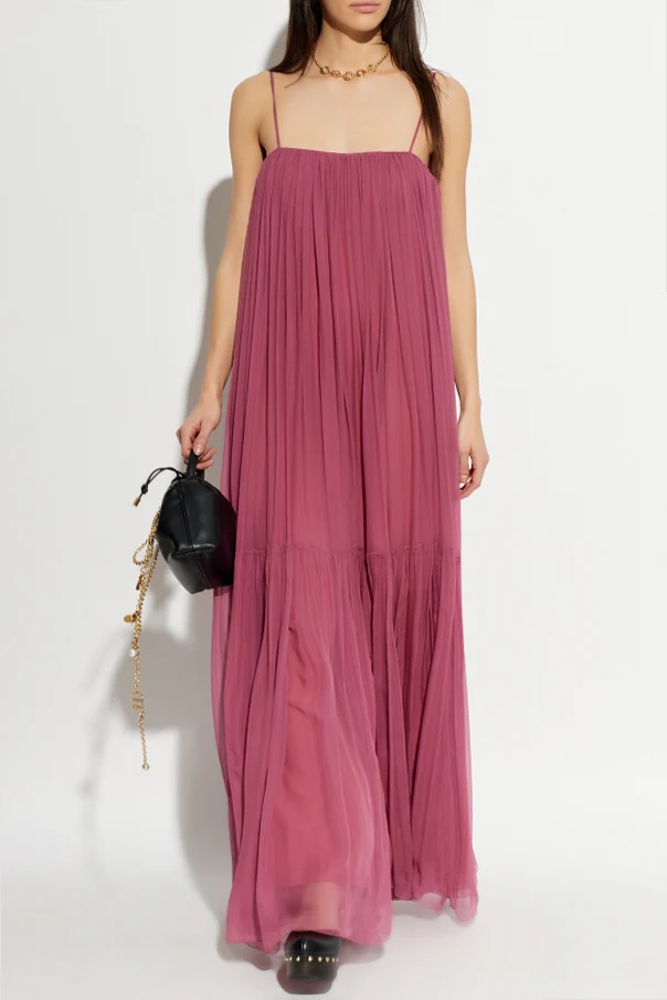 Hier präsentieren wir ein außergewöhnlich elegantes, violettes Seiden-Maxikleid mit freien Schultern von Chloé , kreiert im Zeichen moderner Weiblichkeit. Der lockere, fließende Maxischnitt mit feinen Trägern betont stilvoll die Schultern und unterstreicht dezent das Dekolleté. Harmonisch mit einer geraden Linie am oberen Saum vollendet, begeistert das Kleid durch seine edel schimmernde Oberfläche sowie feine Raffungen. Seine Einzigartigkeit verdankt es dem ausgestellten Rock mit raffinierten Schlitzen und einer vertikalen Falte, die die Silhouette subtil in Szene setzt.