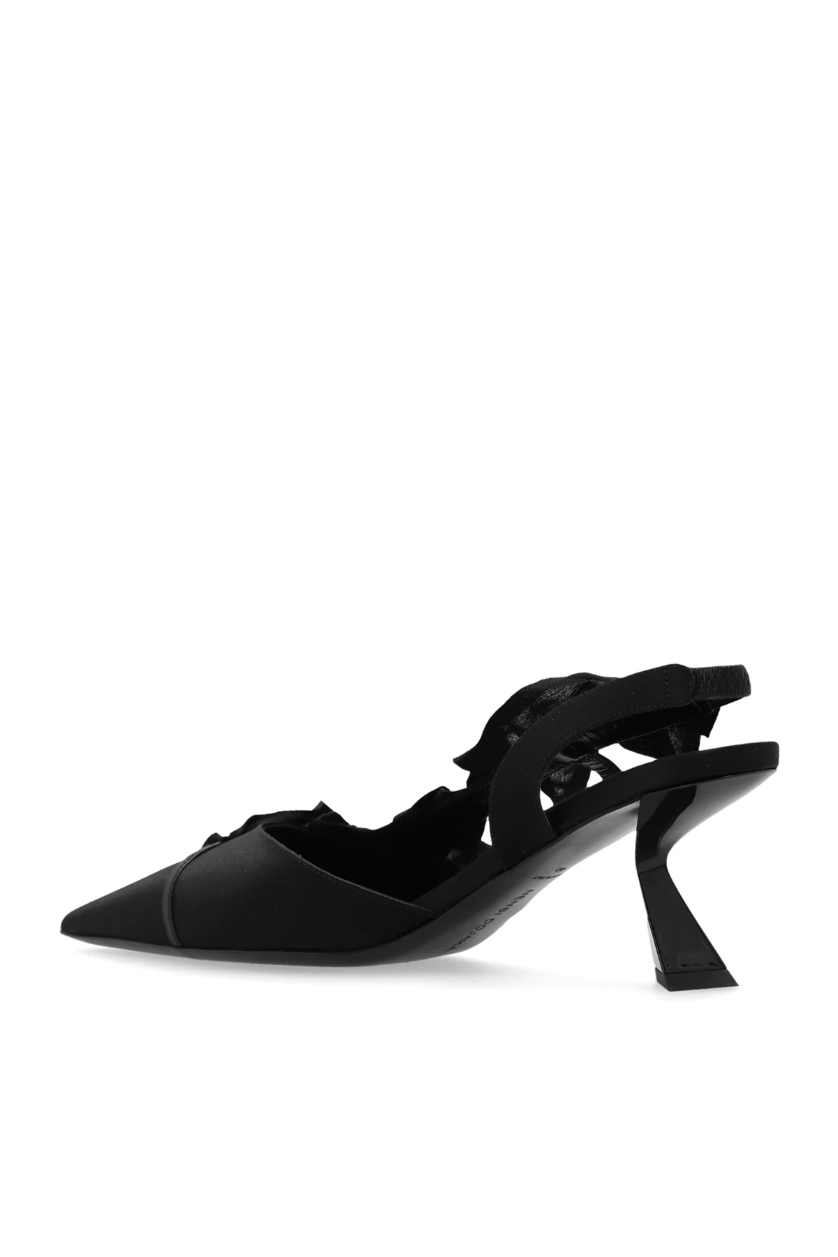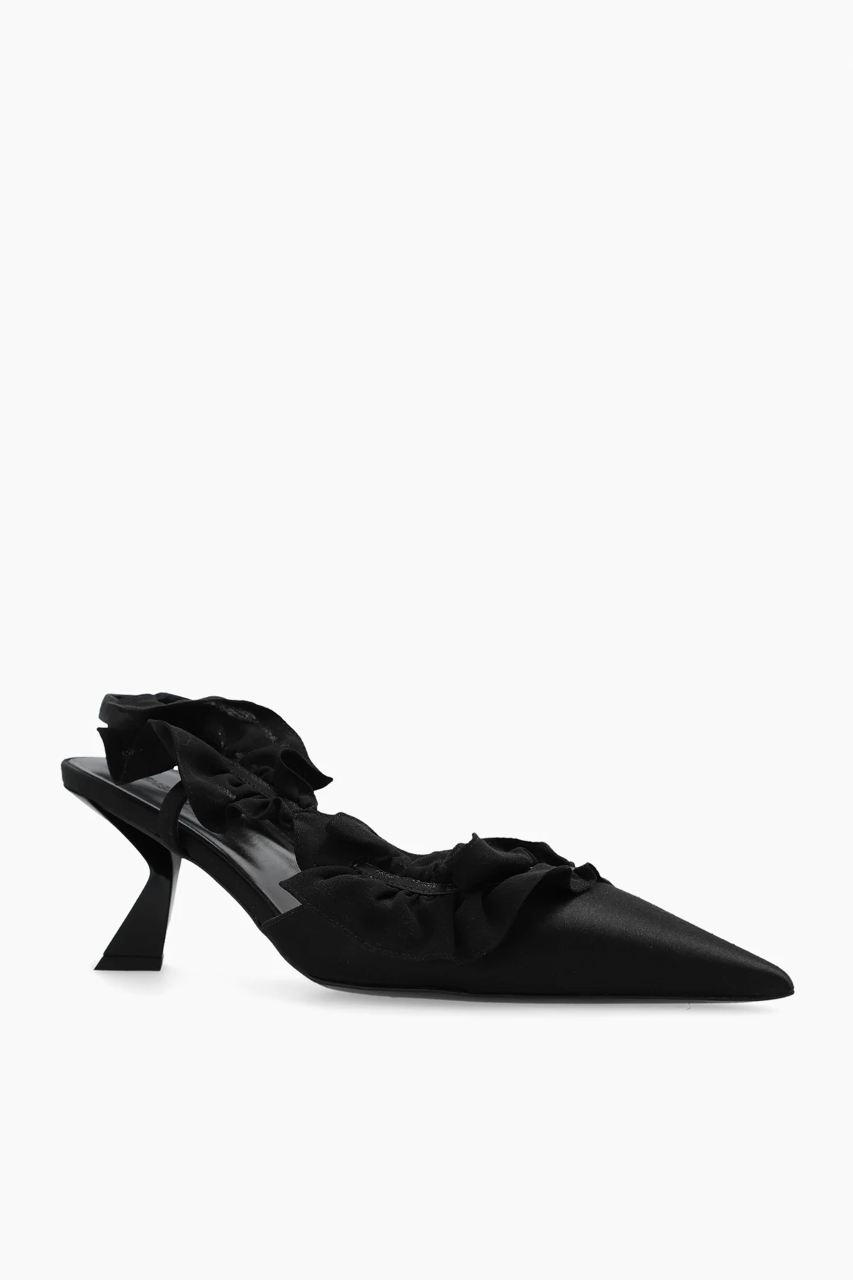 Black pumps from Nensi Dojaka. Crafted from satin, this pair features decorative ruffle trims, a pointed toe, decorative heel and black leather sole.