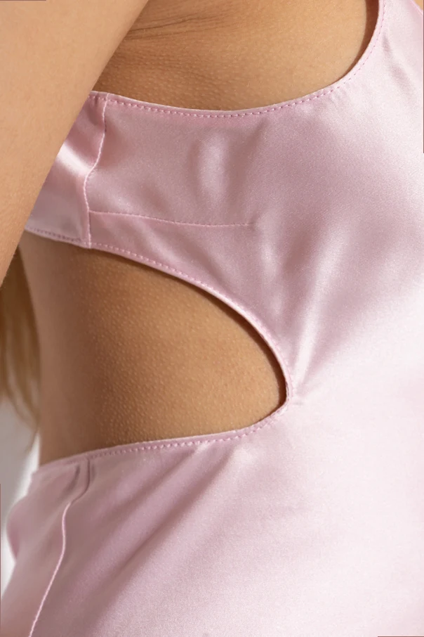 Satin-Camisole-Kleid aus dem Modehaus Courrèges ist die Quintessenz zeitgenössischer Eleganz auf höchstem Niveau. Der rosafarbene Ton unterstreicht die Subtilität dieses Minikleids und harmoniert perfekt mit dem luxuriösen, seidig schimmernden Stoff. Der figurbetonte Schnitt schmiegt sich sanft an die Silhouette, während der kunstvoll ausgestellte Saum jeder Bewegung Leichtigkeit verleiht.