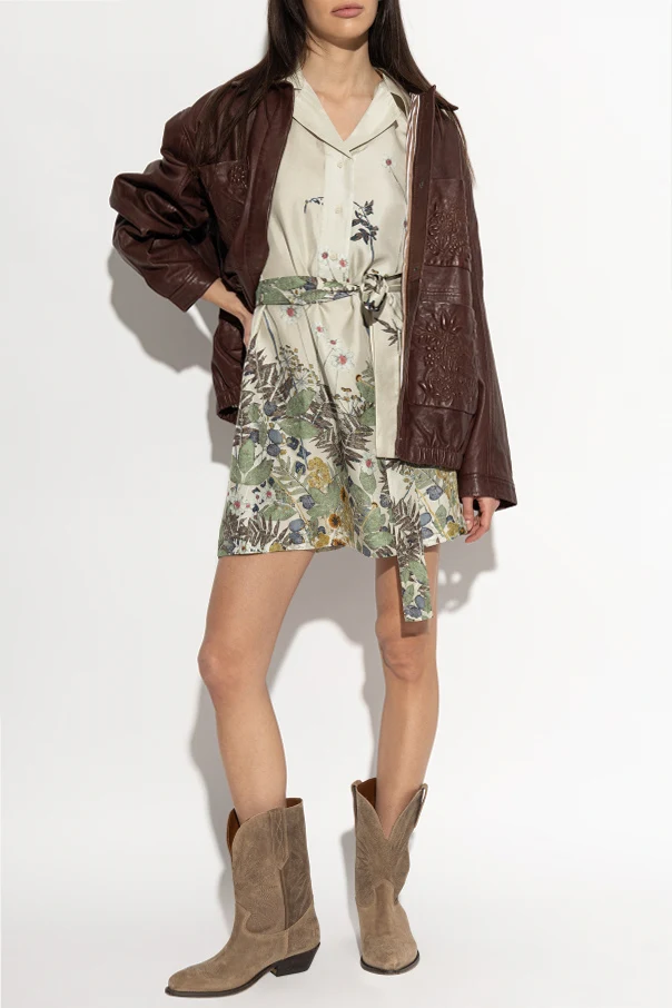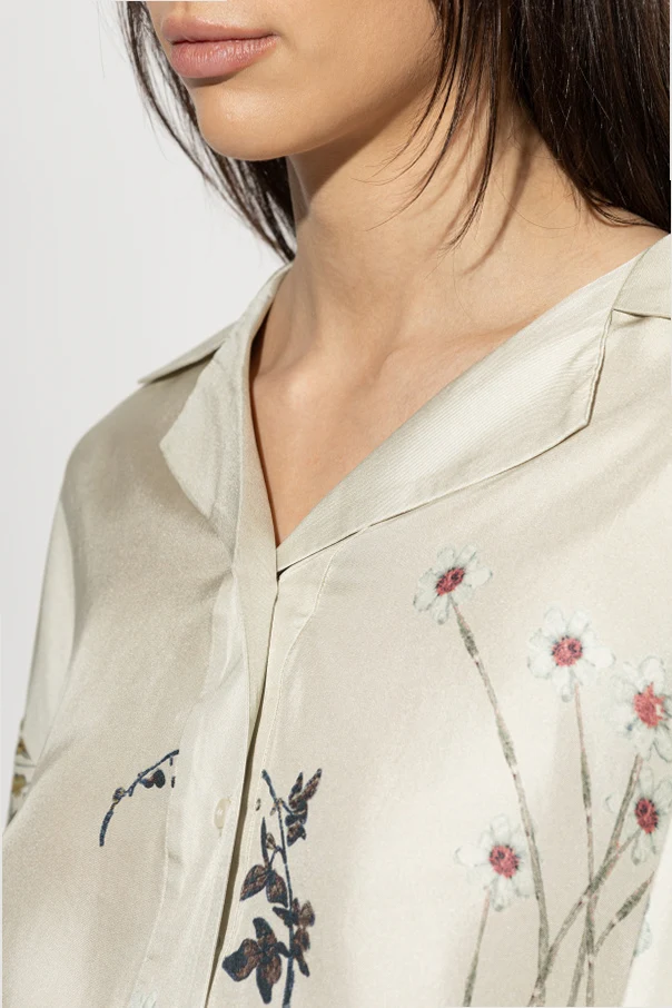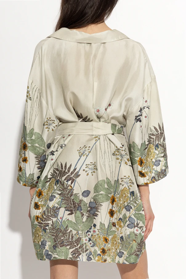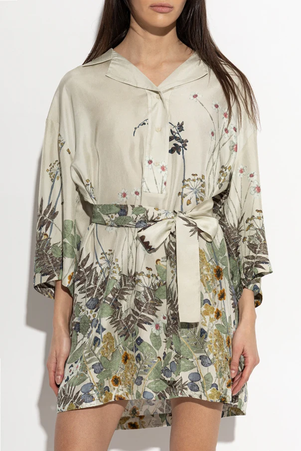 Der untere Teil sowie die Ärmel des Kleides sind mit einem geschmackvollen botanischen Muster verziert – ein zarter Pflanzen- und Blumenprint zieht die Blicke auf sich und bildet einen Kontrast zum glatten Oberteil des Kleides. Luxuriöse Seide mit dezentem Glanz schmiegt sich nicht nur wunderschön an den Körper, sondern bietet zudem ein unvergleichliches Gefühl von Leichtigkeit und Komfort.