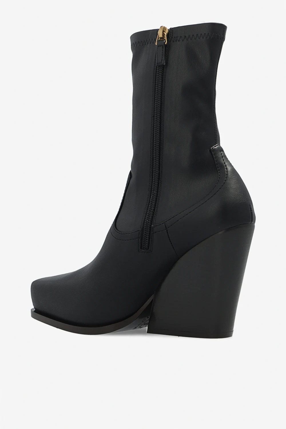 Black heeled ankle boots from Stella McCartney. Crafted from vegan leather, this model features a side zipper and a dark brown heel and a rubber sole.