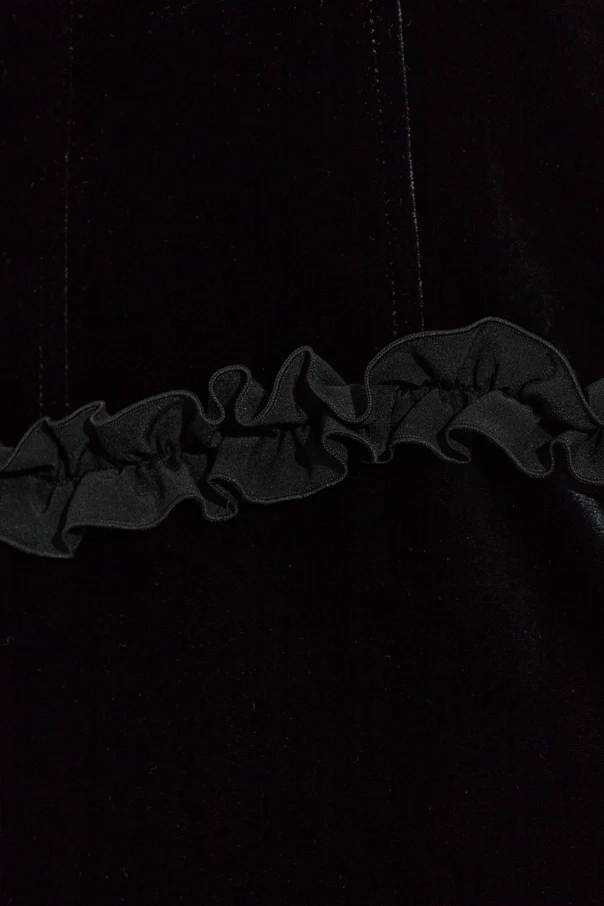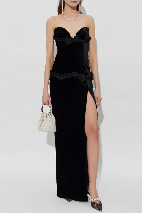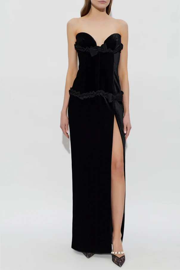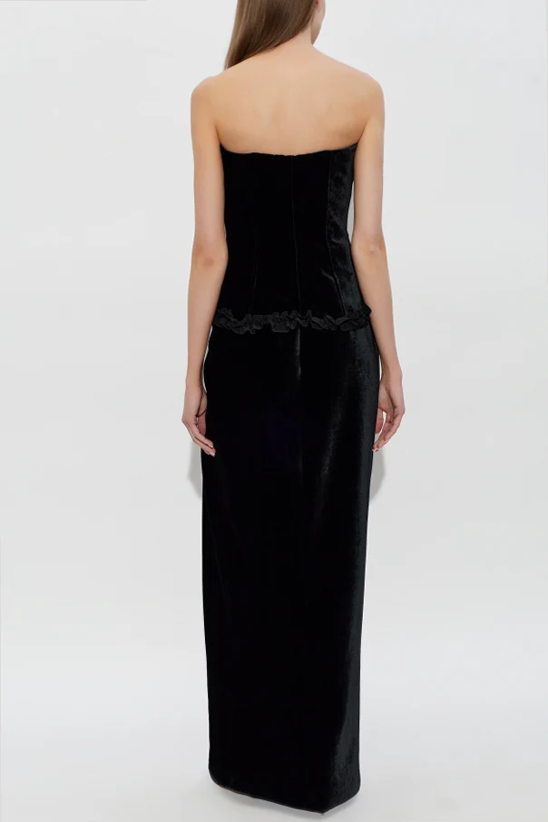 Ein hoher Schlitz auf der linken Seite setzt das Bein dezent in Szene und sorgt für eine verführerische Ausstrahlung. Schmale Samtrüschen entlang der Taille und des Dekolletés, kombiniert mit zarten Satinbändchen, spiegeln die handwerkliche Präzision wider. Extravagantes Schwarz aus hochwertigem Samt, der den Körper mit edlen Stoffen umhüllt, garantiert nicht nur einen spektakulären Look, sondern auch außergewöhnlichen Tragekomfort.