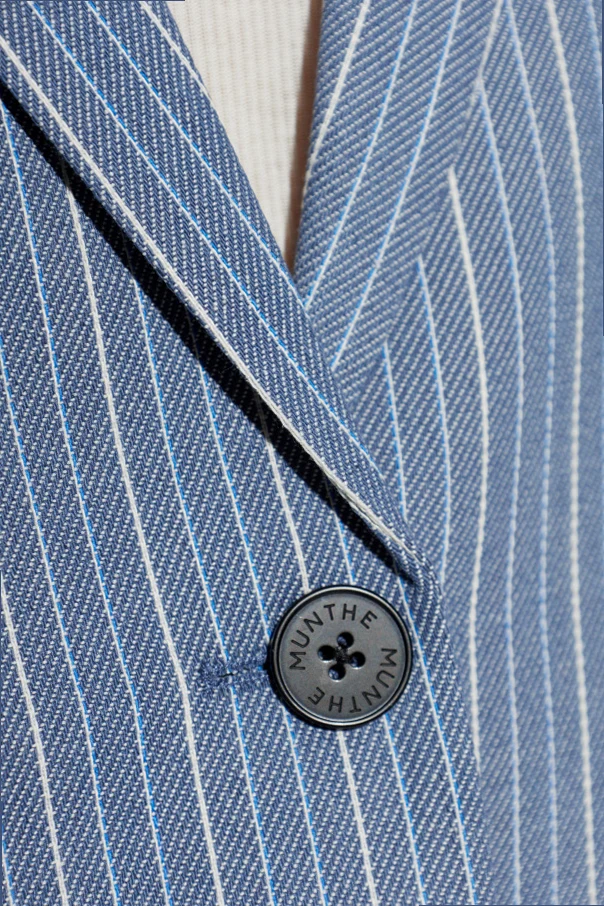 Charmante Details sind die zwei Zierknöpfe mit dem MUNTHE-Logo sowie die außergewöhnlichen Pattentaschen, bei denen das Streifenmuster horizontal angeordnet ist, was den individuellen Charakter des Blazers betont. Das klassische Revers sowie der gerade, lange Rückenteil ohne Schlitz vervollständigen das Gesamtbild und bieten eine Balance zwischen Finesse und Funktionalität.
