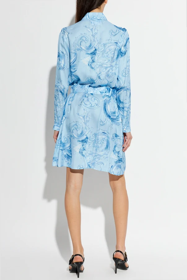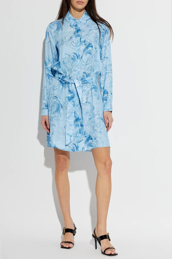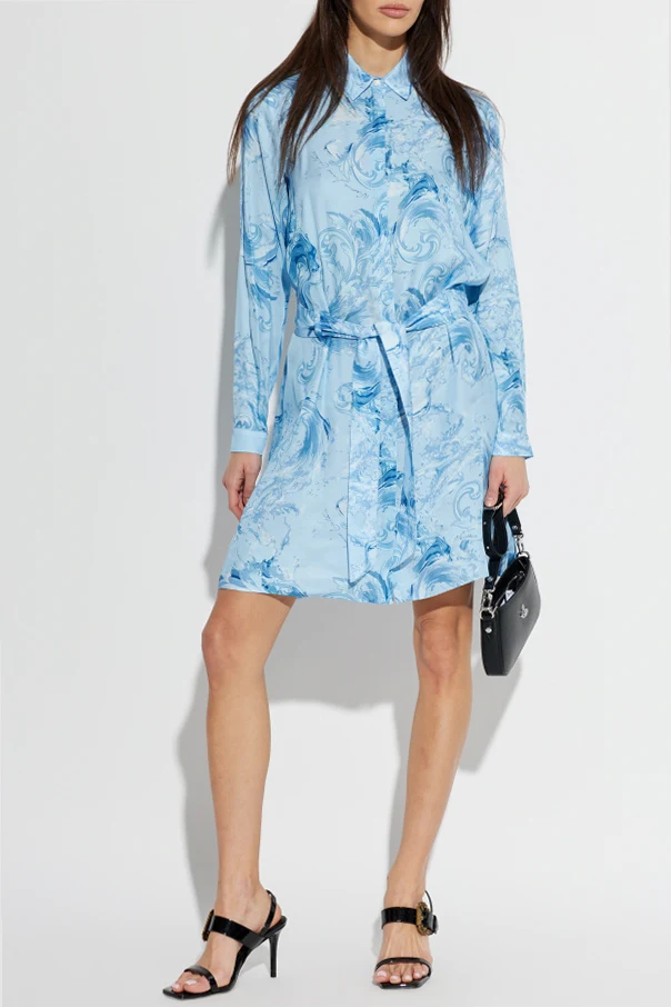 Kleid mit Gürtel von Versace Jeans Couture ist die Quintessenz raffinierten Stils und moderner Eleganz. Gefertigt aus samtweicher Viskose, besticht es durch eine äußerst glatte, satinartige Textur und einen dezenten Glanz, der die Tiefe des Blaus hervorhebt. Der schlichte, leicht oversized Schnitt, der oberhalb des Knies endet, sowie der klassische, an ein Hemd erinnernde Kragen, kombiniert mit einem Gürtel aus demselben Material, betonen eindrucksvoll die Taille und verleihen der Silhouette Harmonie.