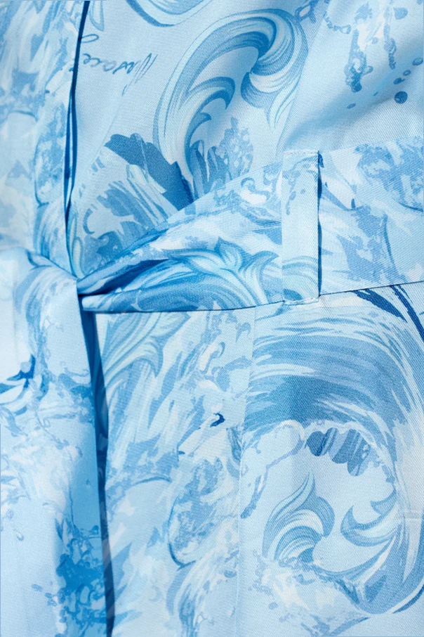 Der künstlerische Print – wellenförmige, marmorierte Kompositionen in verschiedenen Blautönen – verleiht jeder Figur einen einzigartigen Charakter und hebt das exklusive, stilvolle Gesamtbild hervor. Die Knopfleiste, verborgen unter einer feinen Leiste, rundet die kunstvolle Verarbeitung ab.