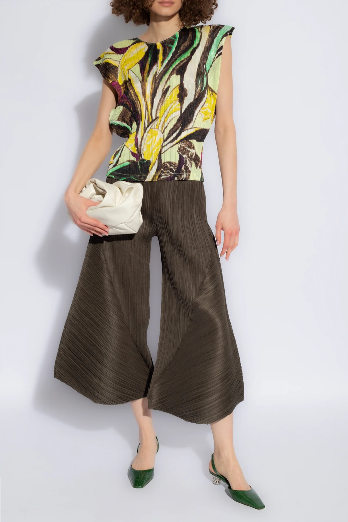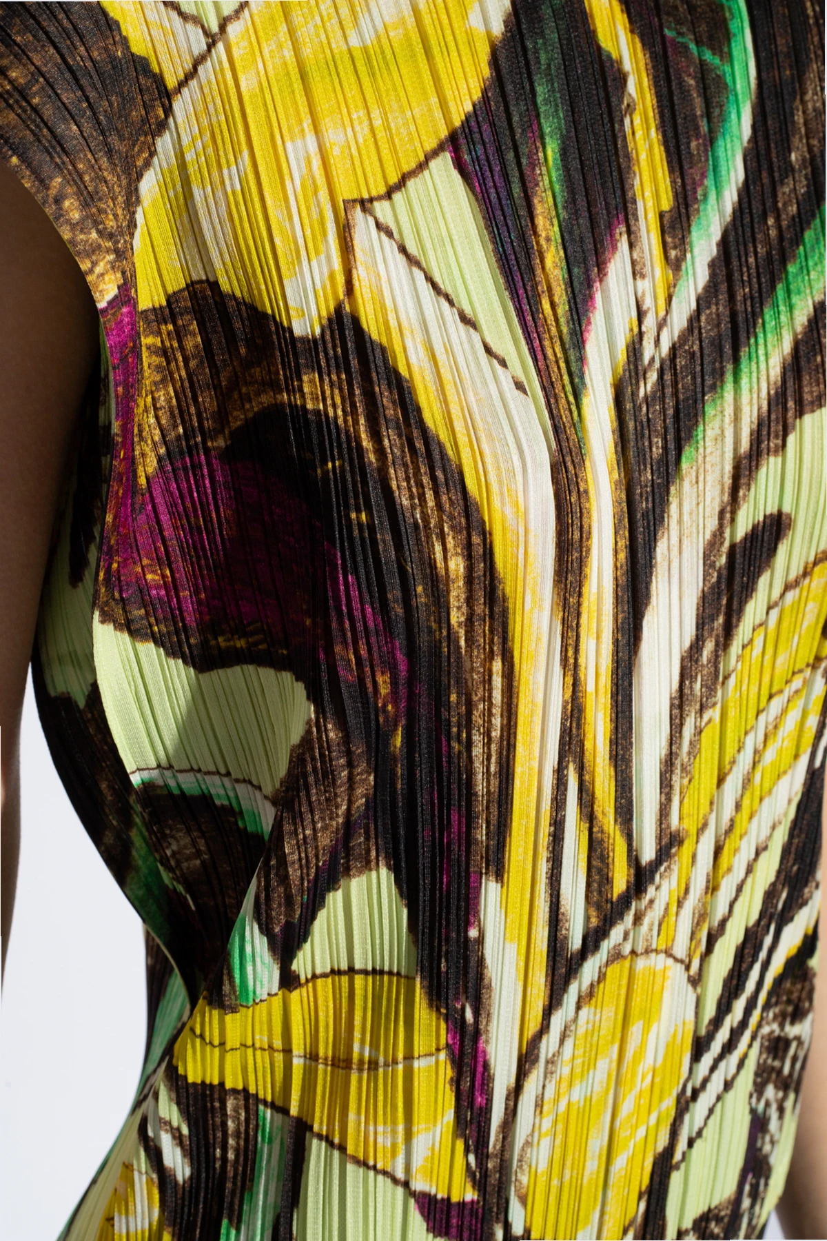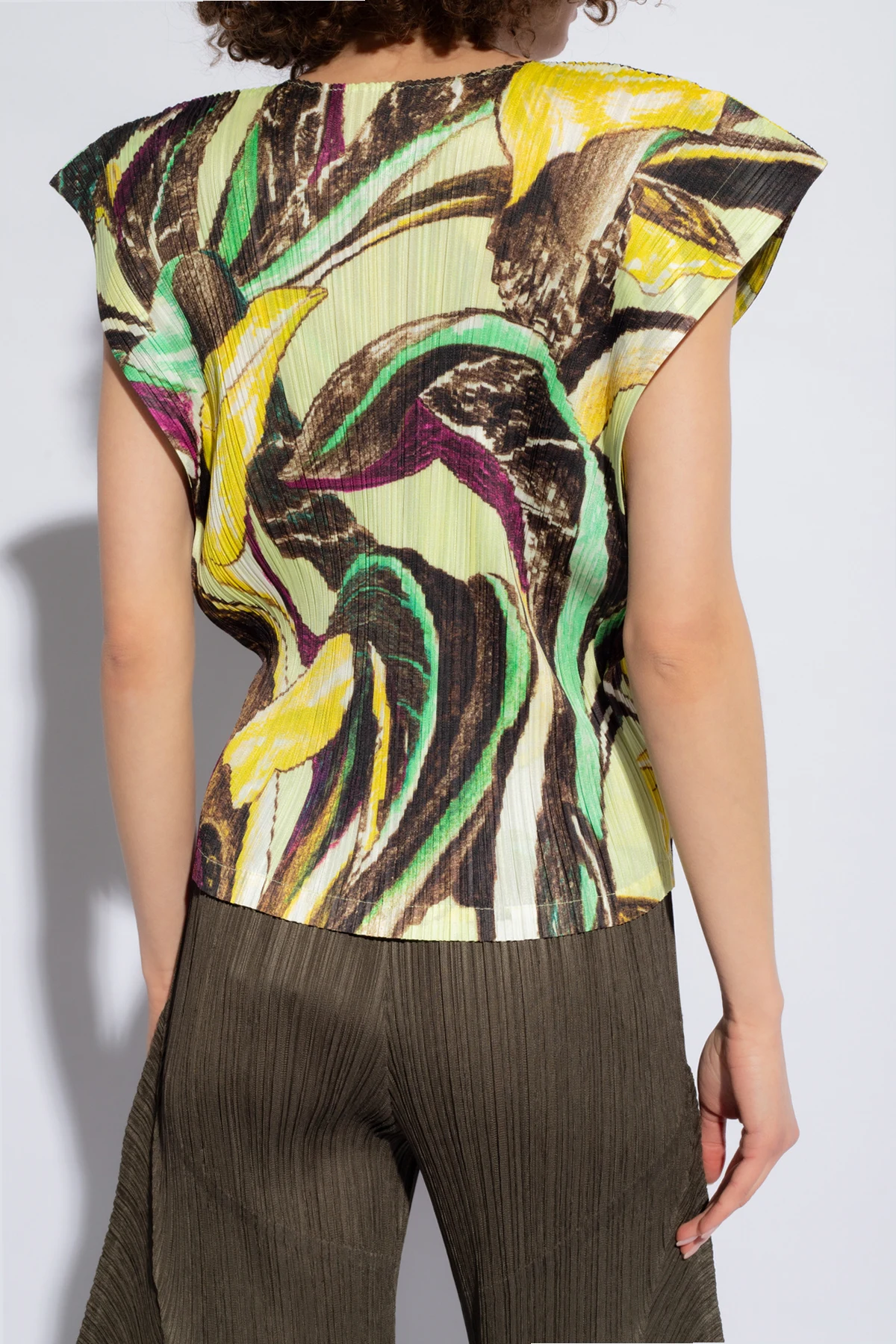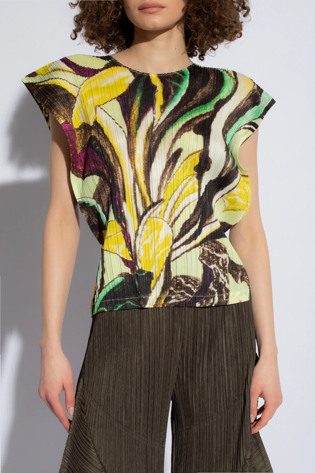 Der bezaubernde plissierte Top aus der Kollektion Issey Miyake Pleats Please ist die Quintessenz raffinierten Stils und außergewöhnlicher Eleganz. Seine mehrfarbige Farbpalette, mit dominierenden Tönen von Gelb, Braun und Schwarz, verflochten in einem abstrakten Muster, das an pflanzliche Motive erinnert, macht dieses Kleidungsstück nicht nur zu einem modischen Statement, sondern zu einem echten Kunstwerk.