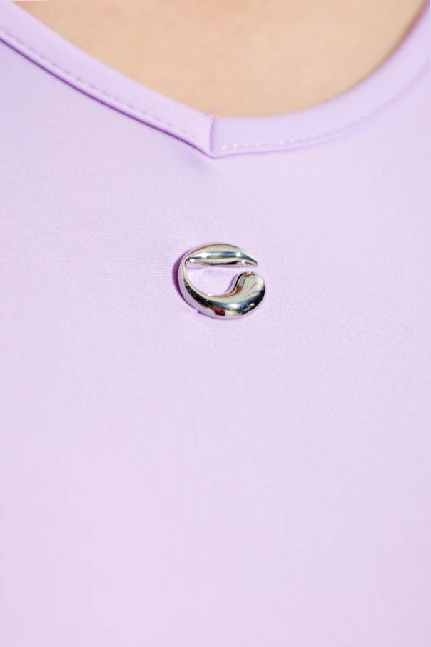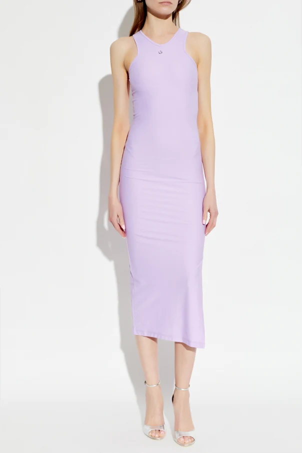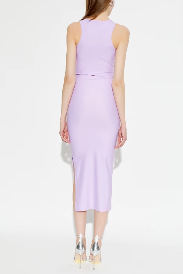 Das Modell ist aus einem außergewöhnlich glatten, elastischen Stoff gefertigt – einer Kombination aus Polyamid und Elasthan, die exzellenten Tragekomfort sowie perfekten Sitz garantiert. Das einfarbige, violette Kleid zeichnet sich durch einen dezenten seitlichen Schlitz und eine minimalistische, metallene Designer-Logo-Emblem direkt unter dem Ausschnitt aus, die einen eleganten Akzent setzen.