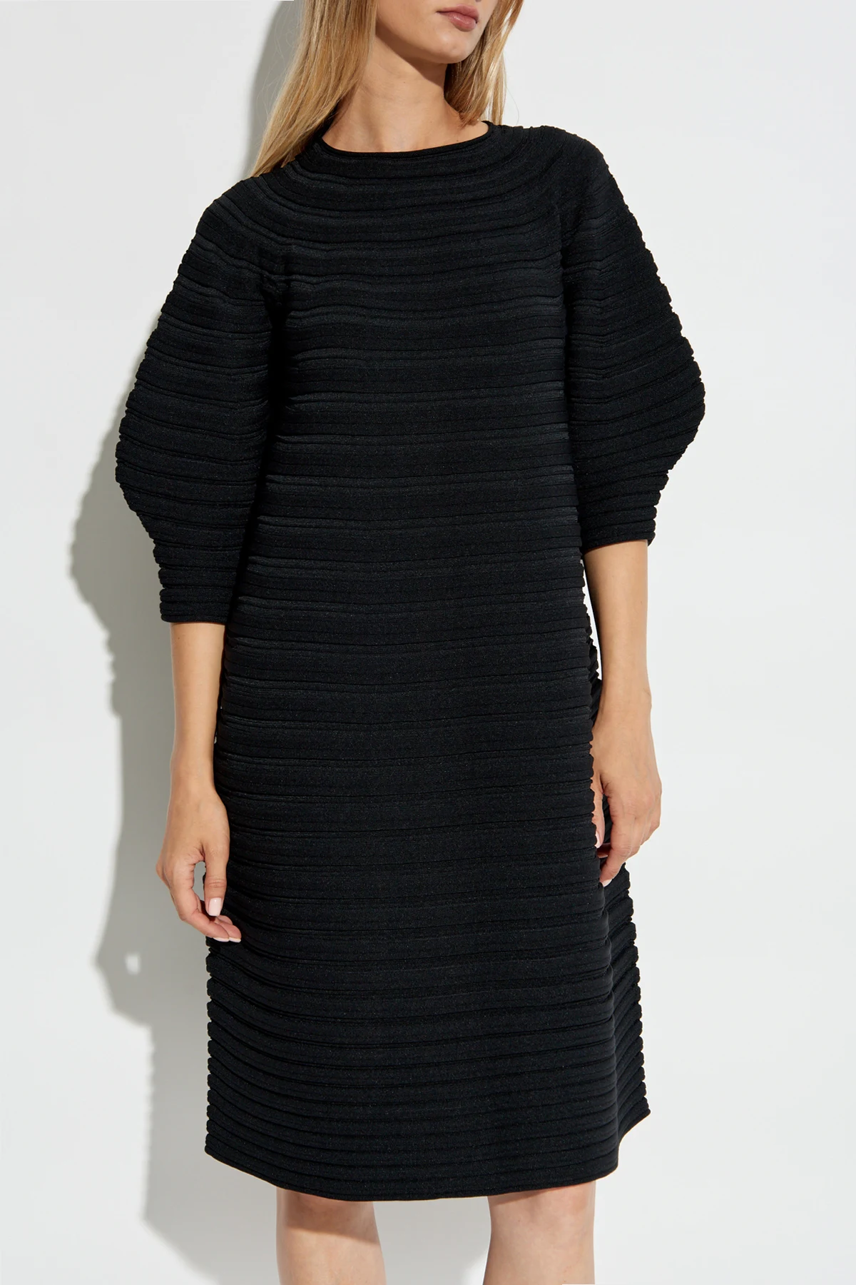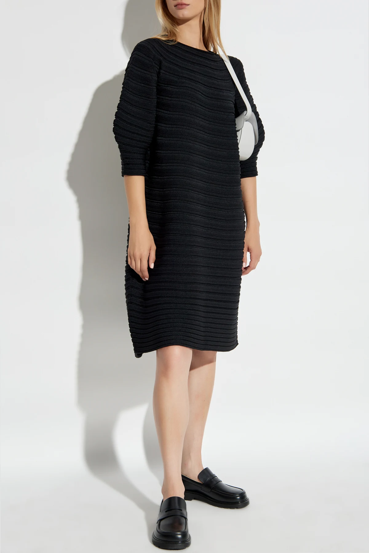 Das minimalistische Design des Kleides wird durch das Fehlen sichtbarer Schriftzüge oder Designer-Logos betont. Der klassische Rundhalsausschnitt sowie die charakteristischen horizontalen Rippungen an den Ärmeln und am gesamten Kleid schaffen eine harmonische Komposition. Durchdachte Details, wie die sorgfältig gearbeiteten Rippungen, verleihen dem Ganzen einen besonderen Charakter.