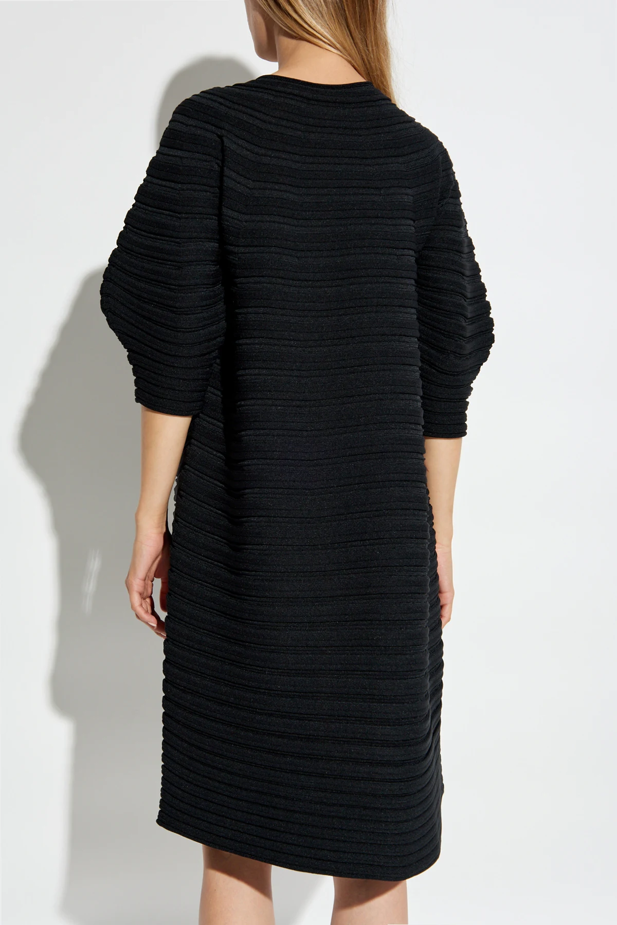 Hergestellt aus hochwertigem Polyester, besitzt das Kleid eine gerippte Struktur, die ihm ein dreidimensionales, texturiertes Muster verleiht. Das weiche und elastische Material sorgt für außergewöhnlichen Tragekomfort und passt sich perfekt der Silhouette an.