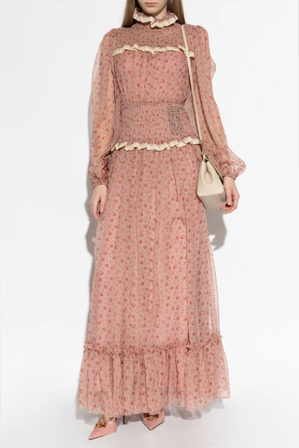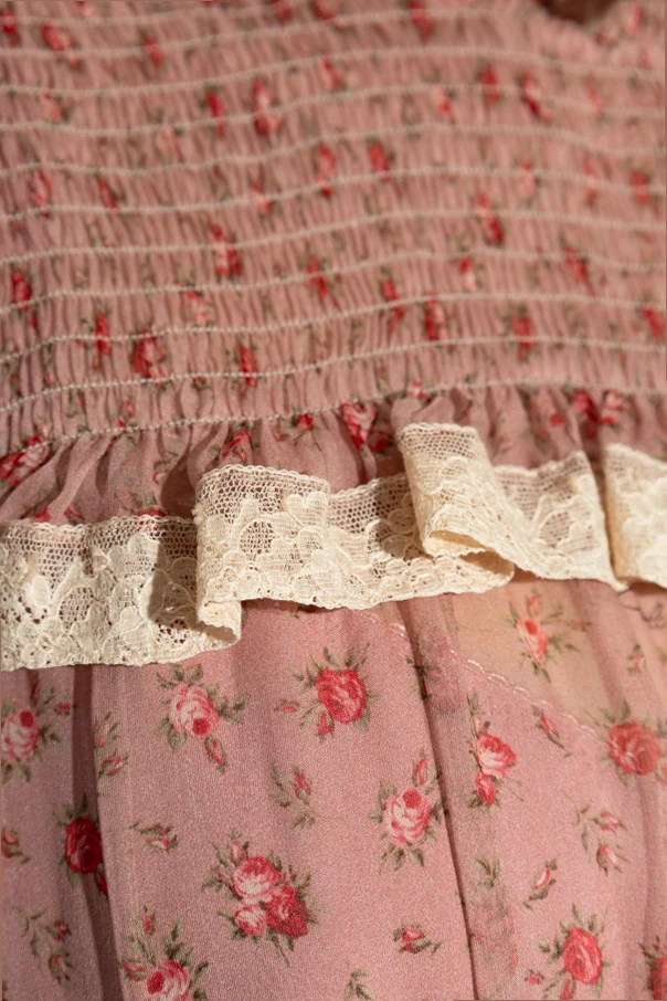 Zarter, halbtransparenter Seidenstoff mit spürbarer Struktur ist mit einem exquisiten, floralen Vintage-Muster veredelt. Das Ganze ist mit dekorativen, cremefarbenen Spitzen abgeschlossen – zu finden an den Manschetten, am Kragen und in den horizontalen Linien an Brust und Taille, die dem Design eine edle Leichtigkeit verleihen.