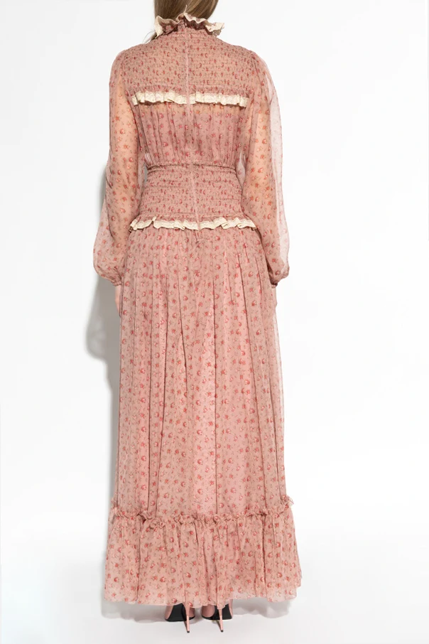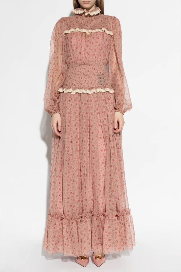 Seidenkleid mit Blumenmuster von Dolce & Gabbana verkörpert italienische Finesse und zeitlose Eleganz. Die atemberaubende, lange Silhouette mit leicht ausgestelltem Saum und betonter Taille umschmeichelt dezent die Figur, während der rosafarbene Ton der Kreation einen außergewöhnlich romantischen Akzent verleiht.