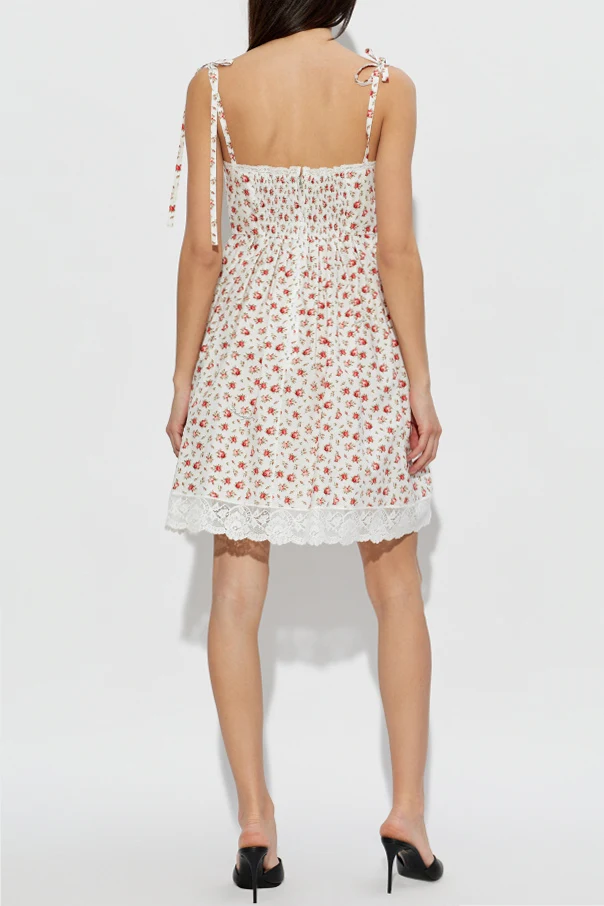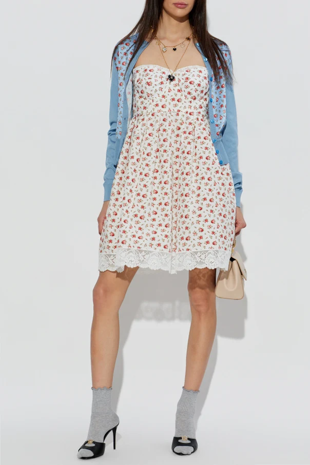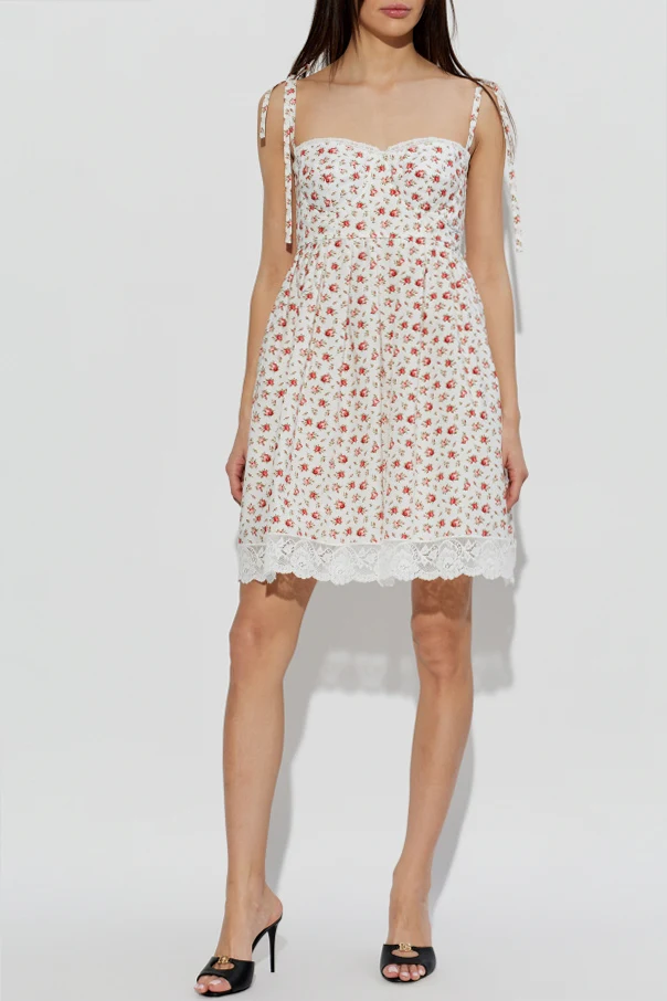 Baumwollkleid mit Spitzenabschluss von Dolce & Gabbana ist die Quintessenz italienischer Raffinesse und zeitloser Eleganz. Das Modell besticht durch eine kurze, ausgestellte Silhouette in zarter A-Linien-Form, die die Figur anmutig betont. Das Oberteil im Bustier-Stil ist figurbetont gearbeitet, mit schmalen Trägern, die zu Schleifen gebunden werden, und zeichnet sich durch eine subtile Formgebung am Busen aus.
