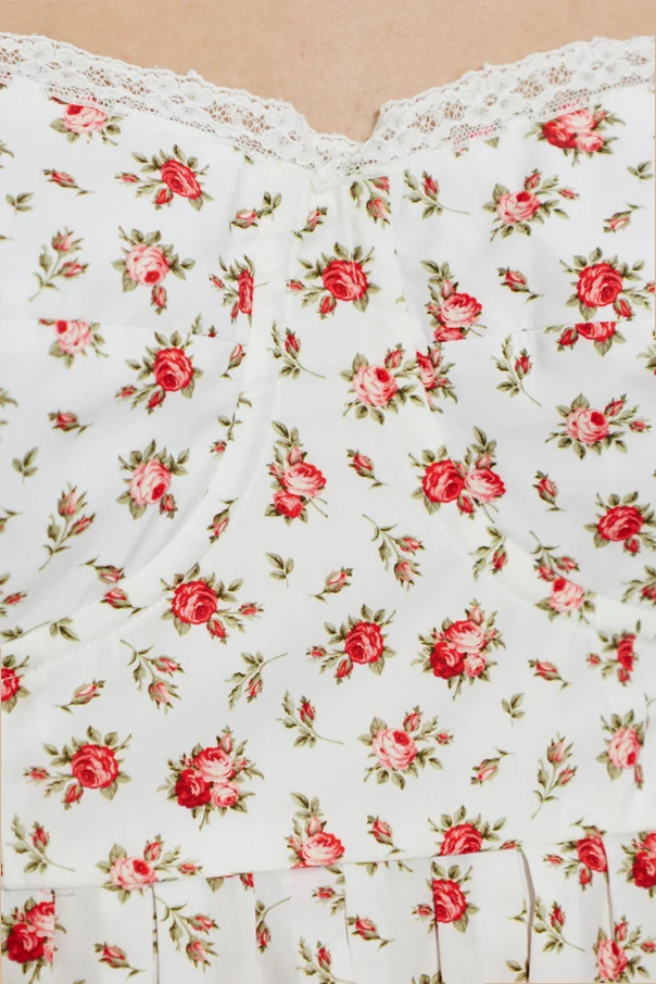 Vor weißem Hintergrund entfaltet sich ein regelmäßiges Muster von Rosenblüten in Rot- und Grüntönen, das dem Kleid einen romantischen, sommerlichen Charakter verleiht. Die federleichte, luftige Baumwolle schmiegt sich sanft und angenehm um den Körper und sorgt selbst an den heißesten Tagen für optimalen Komfort. Der untere Saum sowie der Ausschnitt werden von kunstvoll gearbeiteter weißer Spitze geziert und bilden so ein exklusives Finish.