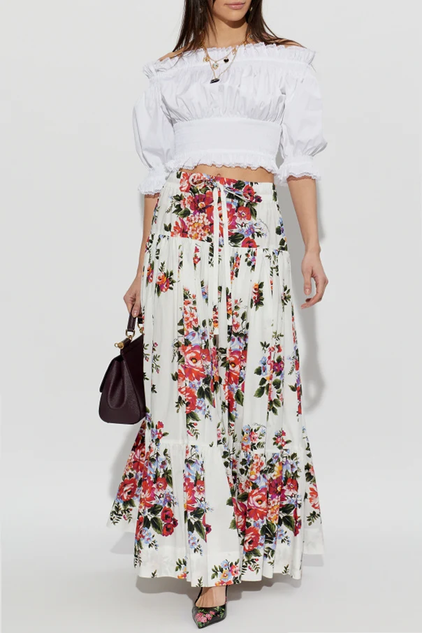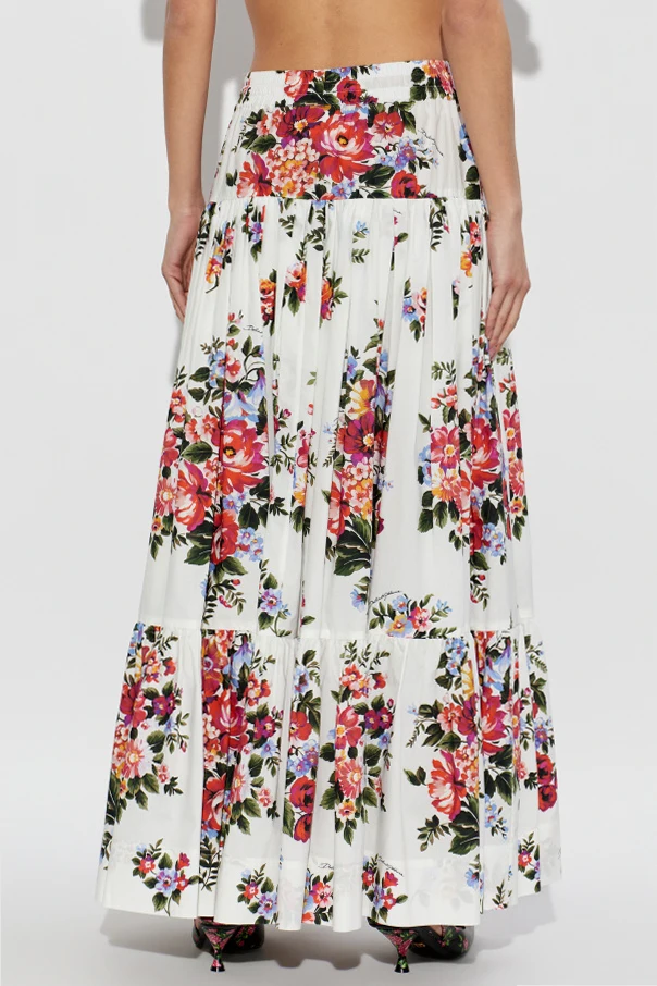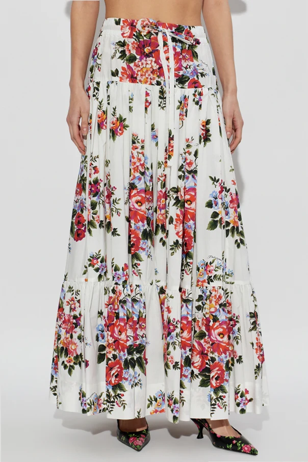 Der Dolce & Gabbana Rock mit Blumenmuster ist eine außergewöhnliche Wahl für Liebhaberinnen des raffinierten Stils. Der ausgestellte, leicht geraffte Schnitt in Knöchellänge umschmeichelt dezent die Figur und betont deren Harmonie, wobei er außergewöhnliche Leichtigkeit in der Bewegung garantiert. Das Modell besticht durch das mehrfarbige florale Muster auf weißem Hintergrund, bei dem kräftige Rot-, Rosa-, Lila- und Gelbtöne harmonisch mit dem Grün der Blätter zusammenspielen und eine Komposition voller künstlerischer Ausdruckskraft schaffen. Die hohe Taille und der breite, geraffte Bund betonen die Taille, während die vordere Schleife dem Rock Originalität und Funktionalität verleiht.