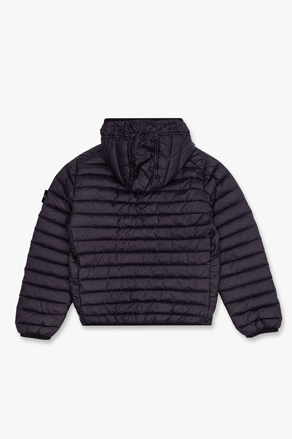 Navy quilted hooded jacket from Stone Island Kids. Fastened with a zip, this model features two zipped front pockets and long sleeves with a detachable logo patch.