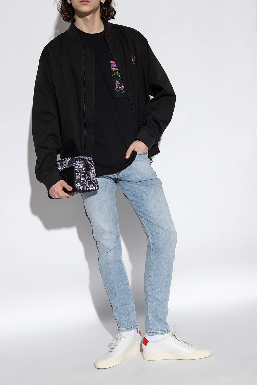 White ‘Tennis 77’ sneakers from Common Projects. Made of leather, this lace-up model sits on a cream rubber and showcases a red heel counter and a signature gold-tone serial number stamped on the side.