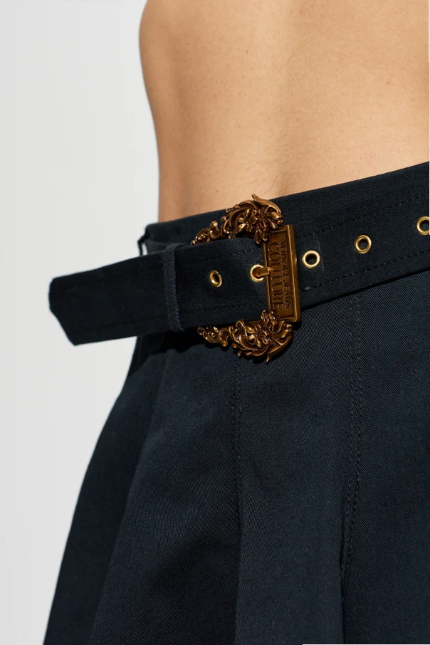 Kurzer Rock mit Gürtel von Versace Jeans Couture ist die Quintessenz moderner Eleganz. Der ausgestellte Schnitt, der mit großzügigen Falten begeistert, verleiht der Silhouette eine subtile Leichtigkeit und Anmut, während der sorgfältig ausgewählte schwarze Stoff mit matter Oberfläche ihren raffinierten Charakter unterstreicht. Die hochwertige Mischung aus Baumwolle und Elastan sorgt dafür, dass der Rock perfekt in Form bleibt und gleichzeitig ein angenehmes Tragegefühl bietet.
