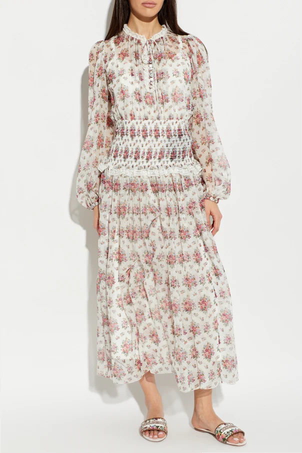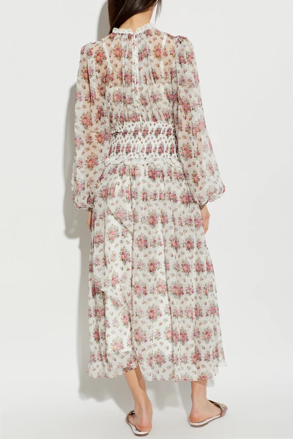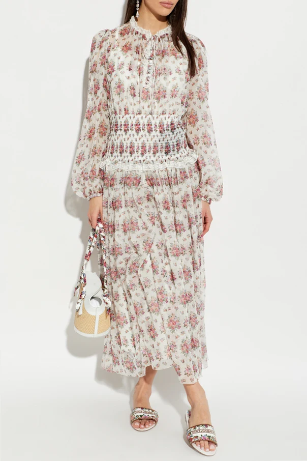 Seidenkleid mit Blumenmotiv von Dolce & Gabbana ist die Quintessenz italienischer Schneiderkunst, bei der die weiße Farbe als Leinwand für zarte Bouquets in Rosa-, Violett- und Grüntönen dient. Der sorgfältig gearbeitete, luftige Schnitt in Midi- oder Maxi-Länge schmeichelt der Silhouette, fällt sanft nach unten aus und bietet volle Bewegungsfreiheit.
