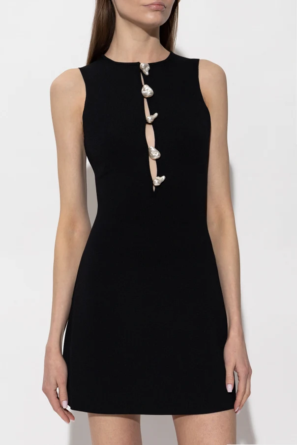 Das Kleid wurde aus hochwertigem, elastischem Strick mit leicht gerippter Struktur gefertigt und bietet dadurch eine perfekte Passform sowie höchsten Tragekomfort. Das herausragende Detail sind die einzigartigen, massiven, unregelmäßigen Perlenknöpfe, die entlang der Vorderseite des Kleides verlaufen – ein auffälliges Element, das alle Blicke auf sich zieht und die außergewöhnliche Liebe zum Detail unterstreicht.
