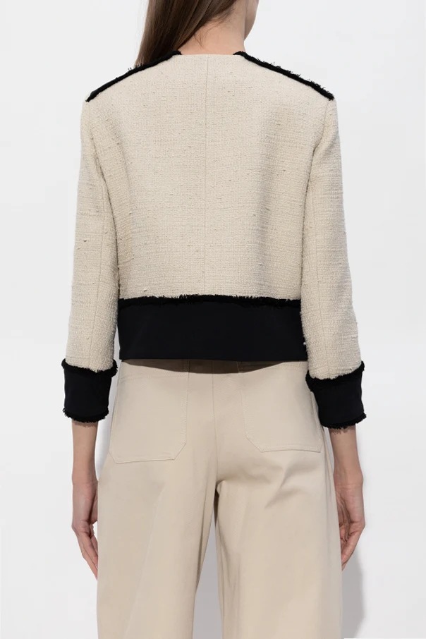 Details in tiefem Schwarz – kontrastierende Paspeln, Ziernähte an Schultern, Ärmeln und am Saum – verleihen dem Blazer Ausdruckskraft und moderne Leichtigkeit. Dezente schwarze Nähte, die Brusttaschen imitieren, bereichern das Gesamtbild um eine feine, faszinierende Note.