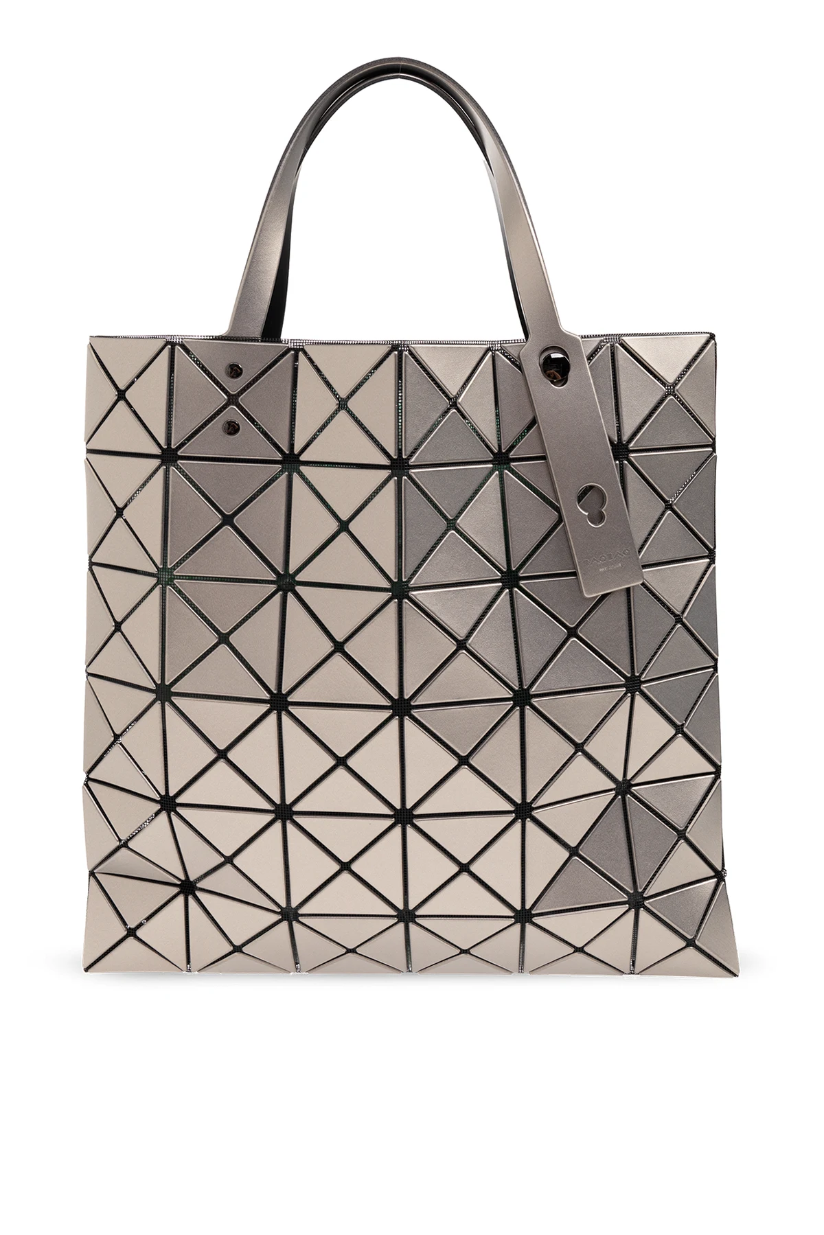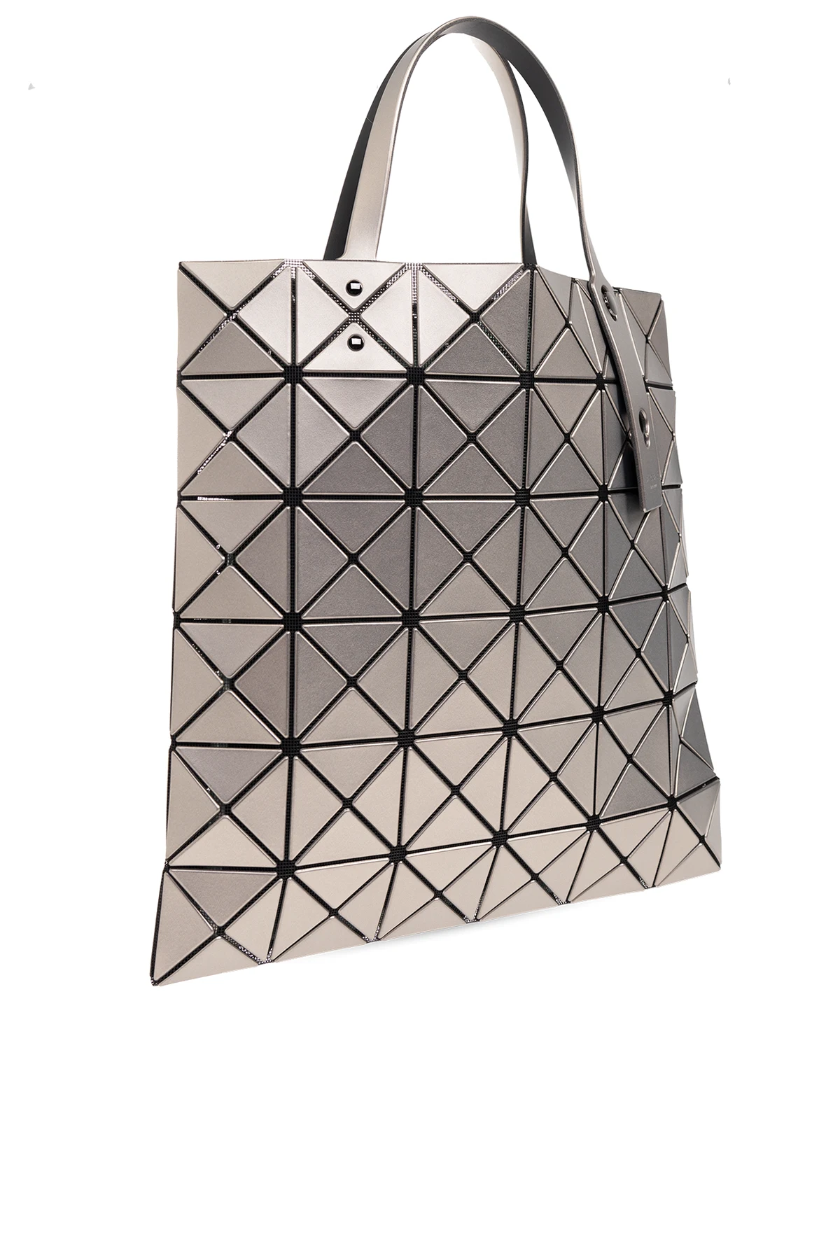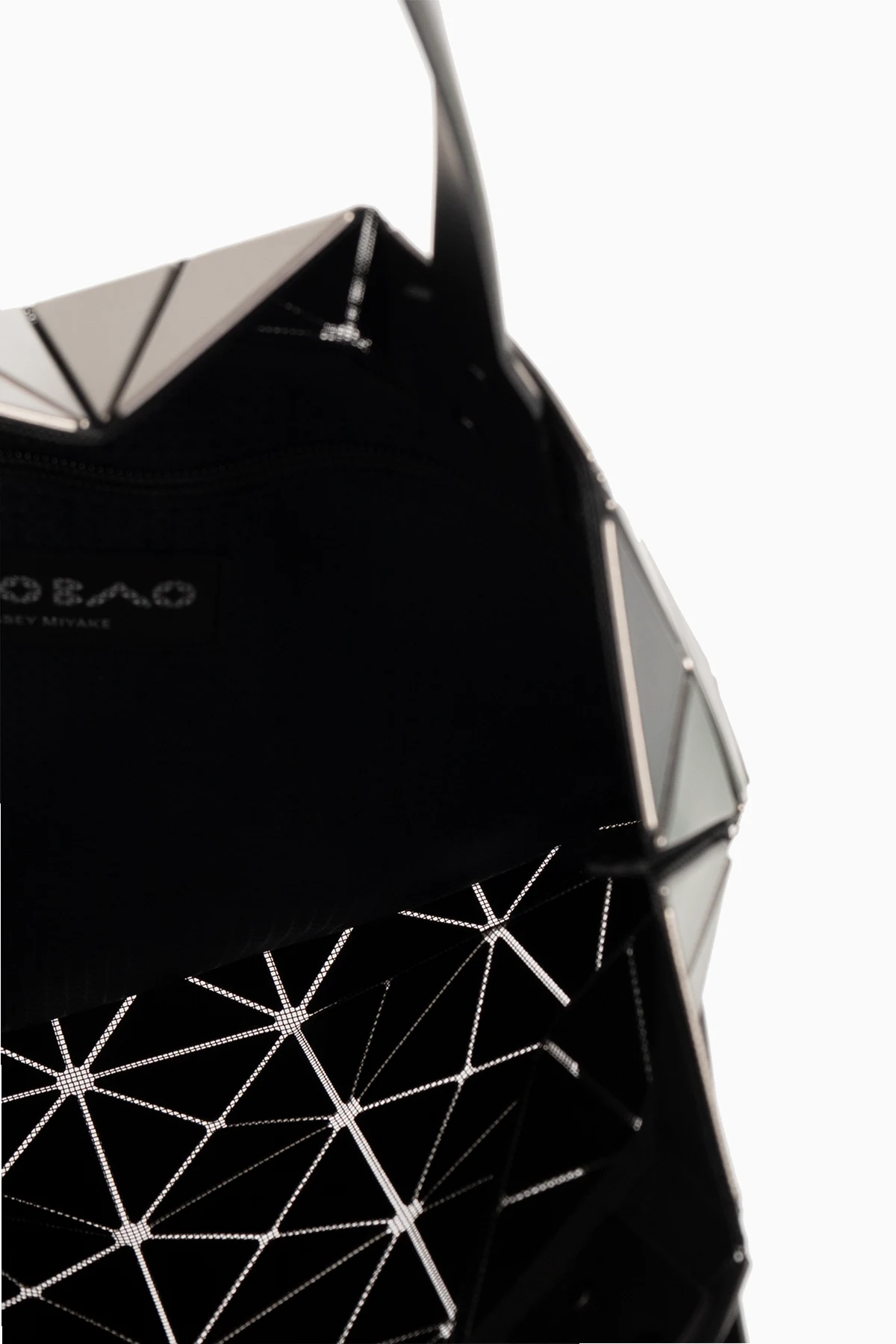 Dark grey ‘Lucent’ shopper bag from Issey Miyake Bao Bao. Made of black fabric covered with a series of rubber applications creating a metallic, geometrical pattern, this design features two half-round handles, dark silver-tone metal hardware and one internal compartment with a zip pocket.