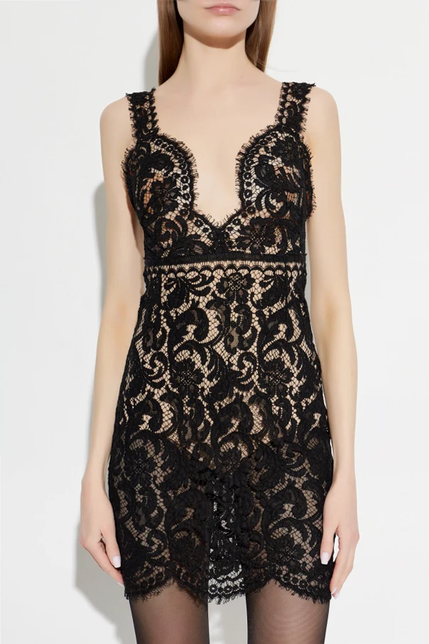 Das Spitzenkleid der Marke Dsquared2 ist die Quintessenz von raffiniertem Stil und Weiblichkeit, entworfen für Liebhaberinnen zeitloser Eleganz. In einem tiefen, schwarzen Farbton gehalten, zeichnet es sich durch die ausgearbeitete Mini-Form, eine deutlich betonte Taille und einen tiefen V-Ausschnitt aus.