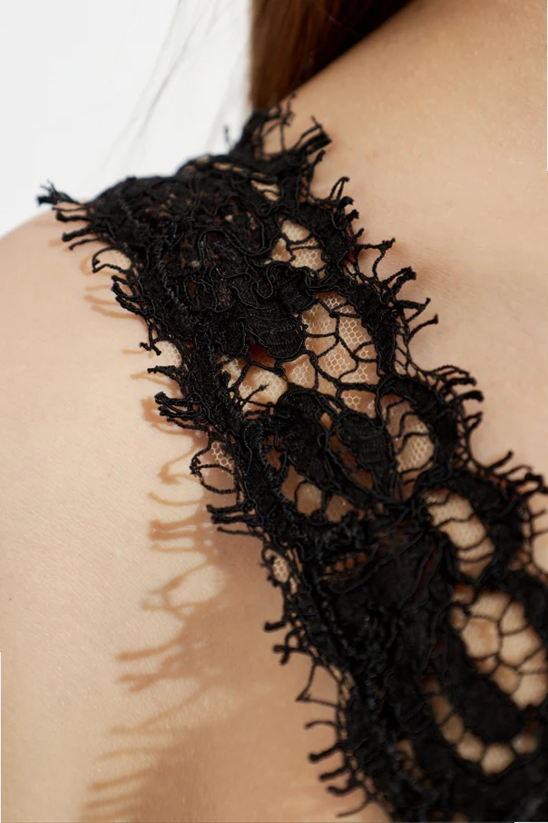 Das Material des Kleides besteht aus effektvoller, schwarzer Spitze auf transparentem Untergrund, das mit einer Fülle an floralen und pflanzlichen Mustern mit dezent dreidimensionaler Struktur begeistert. Besonders ins Auge fällt das äußerst luxuriöse Finish: dekorative, breite Träger und die Ränder des Kleides faszinieren mit charakteristischen, ausgefransten Verzierungen, die die Einzigartigkeit des Produkts unterstreichen.