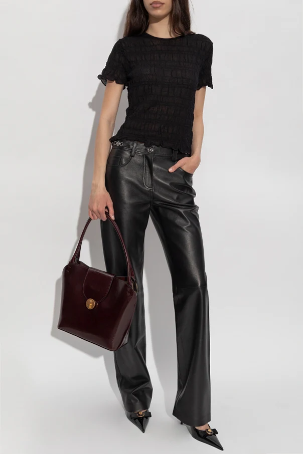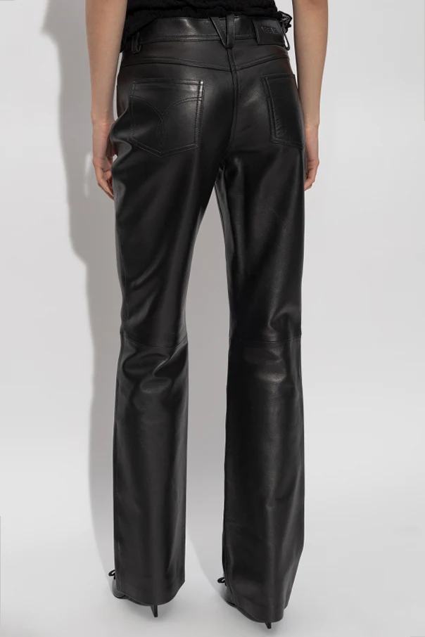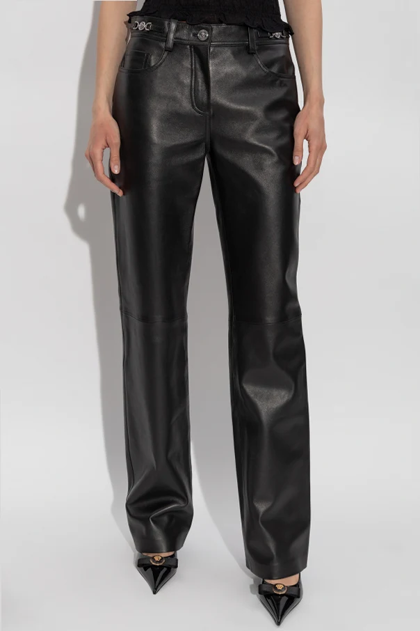 Lederhose von Versace verkörpern die Quintessenz von Eleganz und anspruchsvollem Stil, verwurzelt in der reinsten Form italienischer Handwerkskunst. Klassisch geschnitten, mit leicht ausgestelltem Bein und mittelhohem Bund, betonen sie perfekt die feminine Silhouette, während die taillierte Passform an den Hüften außergewöhnlichen Tragekomfort bietet.