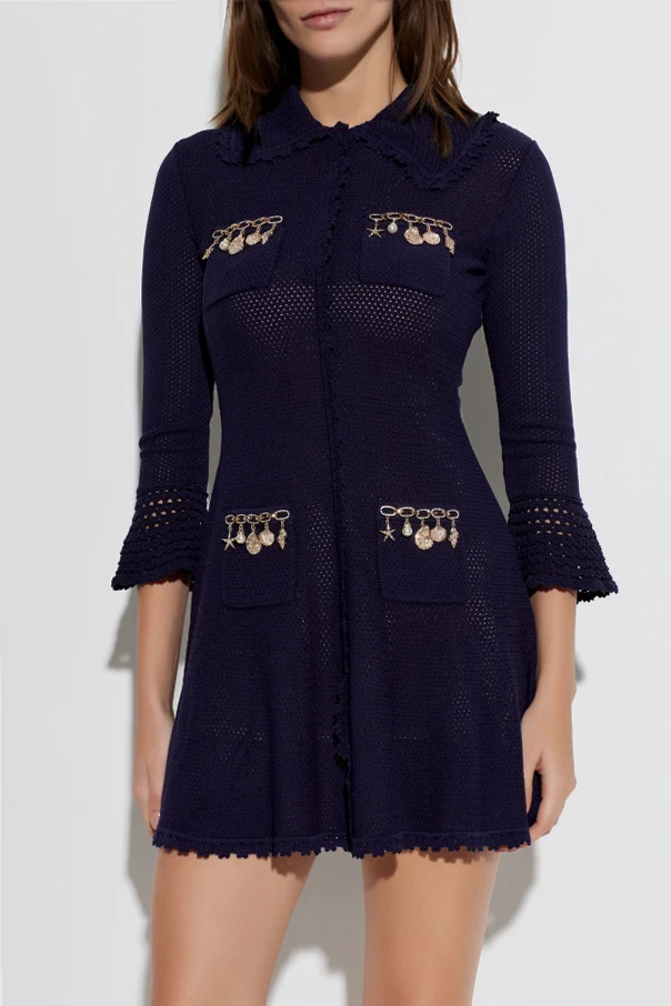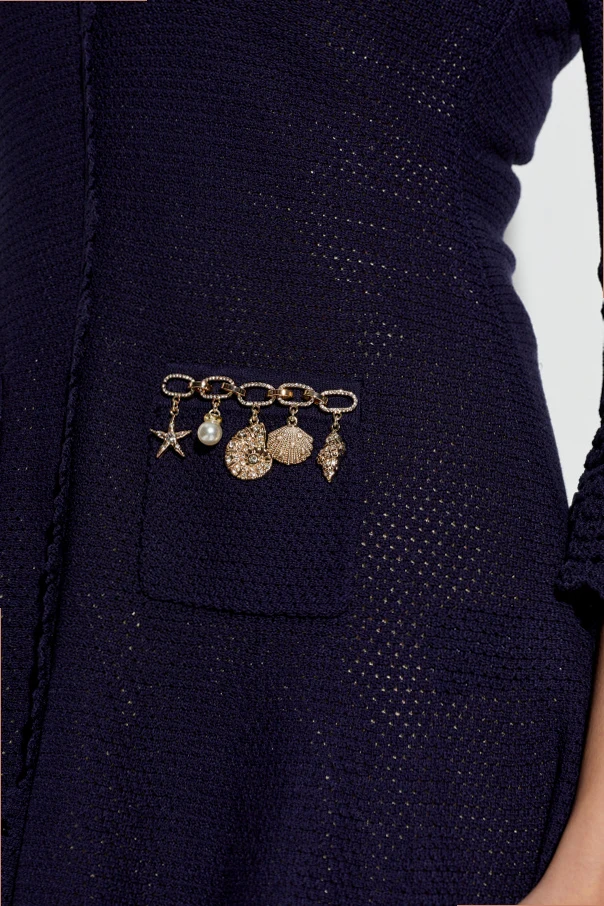 Der Charme dieser Kreation liegt in der außergewöhnlichen Struktur – ein einheitliches, transparentes, feines Netzstrukturmuster aus hochwertigem Strick, das auf Viskose und Polyamid basiert und für Leichtigkeit sowie Atmungsaktivität sorgt. Besonders auffällig sind die aufgesetzten Taschen, die durch ihre Alltagstauglichkeit überzeugen und mit exquisiten, goldenen Anhängern in Form von Ketten verziert sind. Diese ziehen dezent den Blick auf sich und unterstreichen den anspruchsvollen Charakter des Designs. Die dunkelblaue Farbe fügt sich harmonisch in das Konzept zeitloser Eleganz ein.