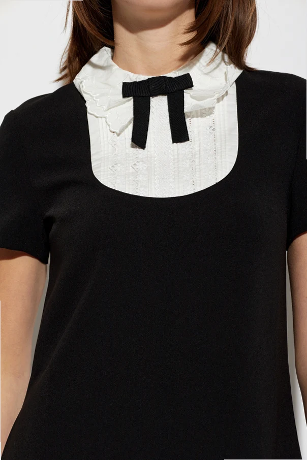 Das Kleid ist aus ausgewähltem, glattem Polyester mit leicht matter Oberfläche gefertigt. Besonders hervorzuheben ist das dekorative Joch am Ausschnitt, das mit einer jacquard- oder spitzenbesetzten Rüsche sowie einer flachen schwarzen Schleife veredelt ist. Die breite, einzelne Rüsche am Saum verleiht dem gesamten Outfit raffinierte Bewegung und Leichtigkeit.