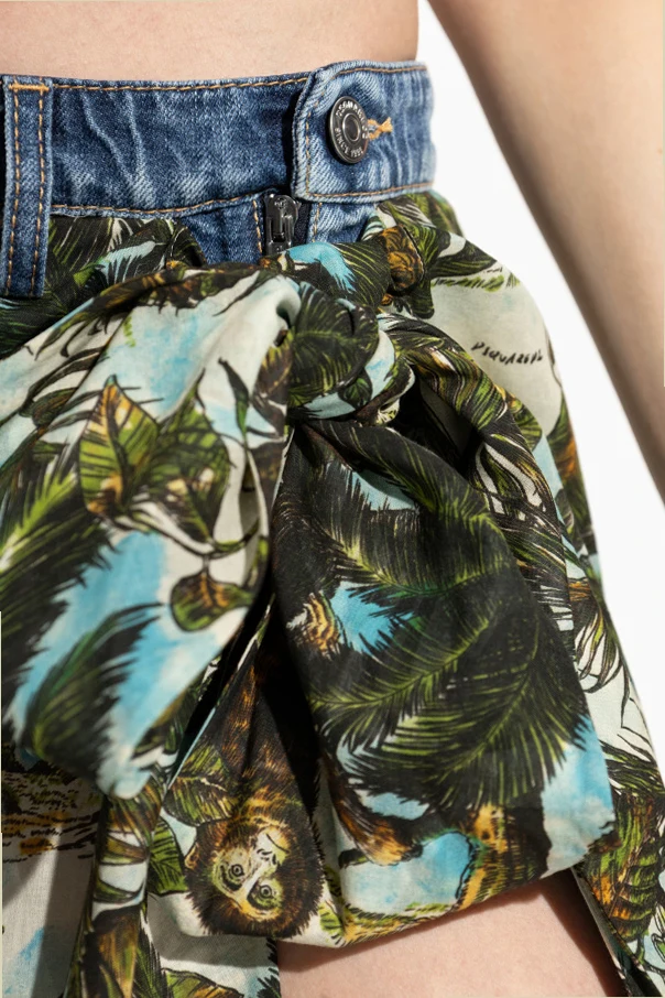 Der obere Teil ist mit einem Bund in klassischem hellblauen Jeans-Look, einem dekorativen Reißverschluss sowie einem Knopf raffiniert verarbeitet und verleiht dem Rock einen einzigartigen Charakter. Die restliche Oberfläche ist von einem kraftvollen, tropischen Multicolor-Muster umgeben – atemberaubende Palmenblätter, exotische Papageien und verspielte Affen ziehen alle Blicke auf sich.