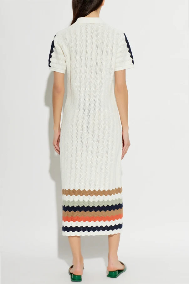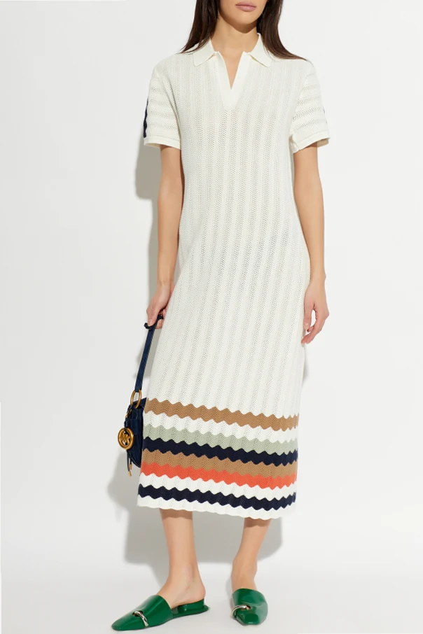 Baumwollkleid mit Streifenmuster begeistert mit der subtilen Form und der meisterhaften Balance zwischen klassischer Eleganz und raffinierter Modernität. Gefertigt aus hochwertiger, weicher Baumwolle, bietet es unvergleichlichen Tragekomfort und Atmungsaktivität, die durch das perfekte, durchbrochene Strickmuster unterstrichen wird. Das weiße Farbschema bildet den idealen Hintergrund für kunstvoll gewellte Streifen in Beige-, Schwarz-, Khaki-, Rot-, Marineblau-, Braun- und Weißtönen, wodurch das Kleid einen unverwechselbaren Charakter erhält.