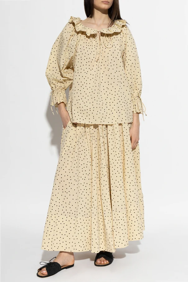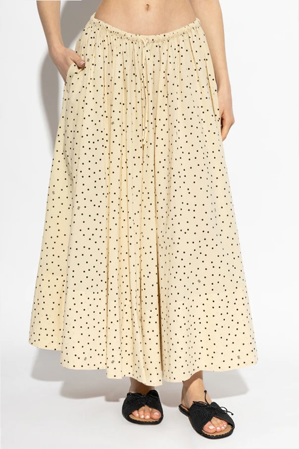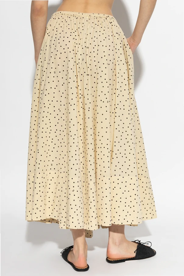 Regelmäßig angeordnete, schwarze Punkte auf beigem Hintergrund schaffen ein zeitloses, edles Muster, das die minimalistische und zugleich ausdrucksstarke Ästhetik des Designs unterstreicht. Der breite, elastische Bund sorgt für außergewöhnlichen Tragekomfort und passt sich optimal der Figur an, wobei er ihre Vorzüge betont. Praktische Seitentaschen sind dezent in die Nähte eingearbeitet und bieten zusätzliche Funktionalität und Komfort.